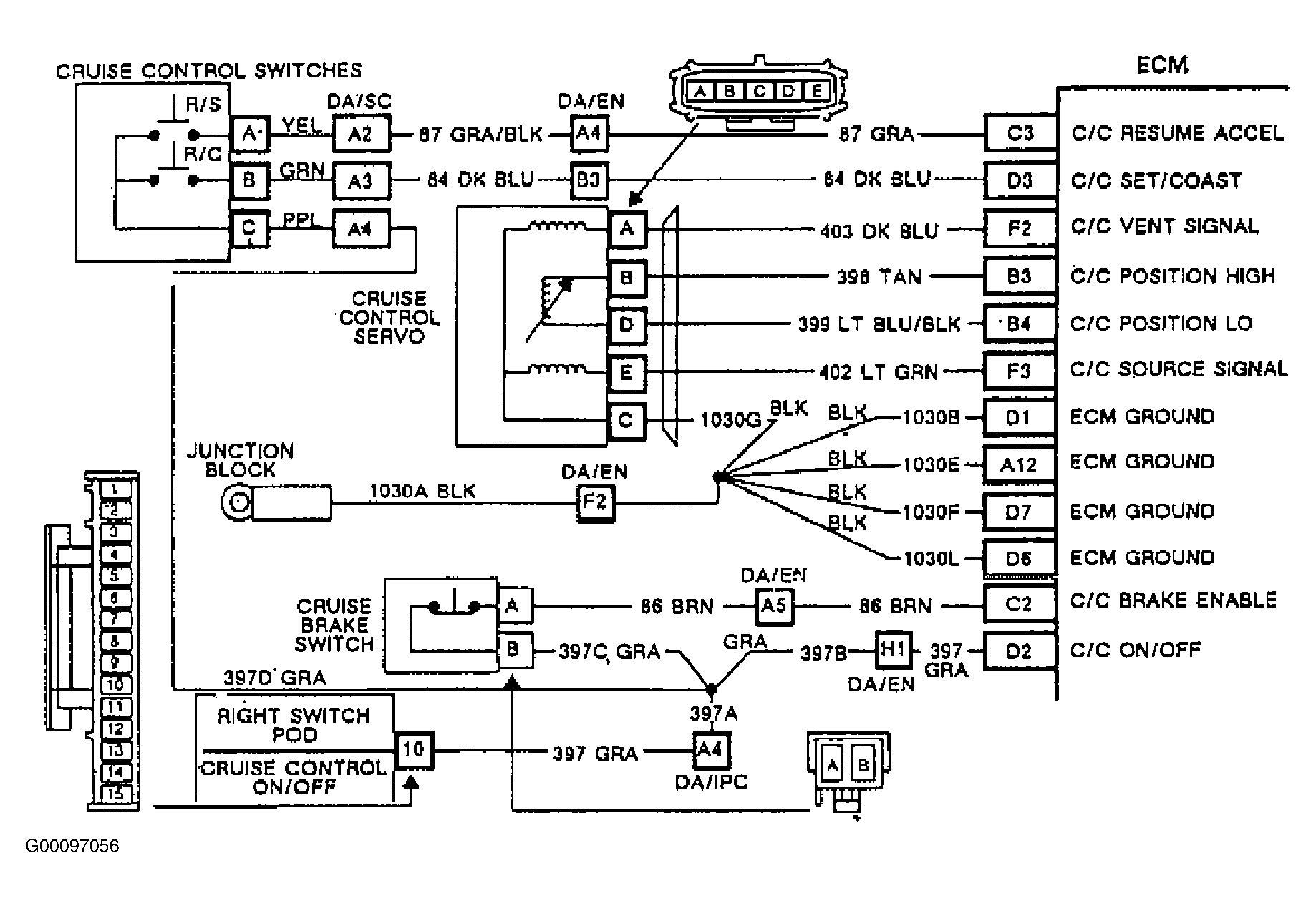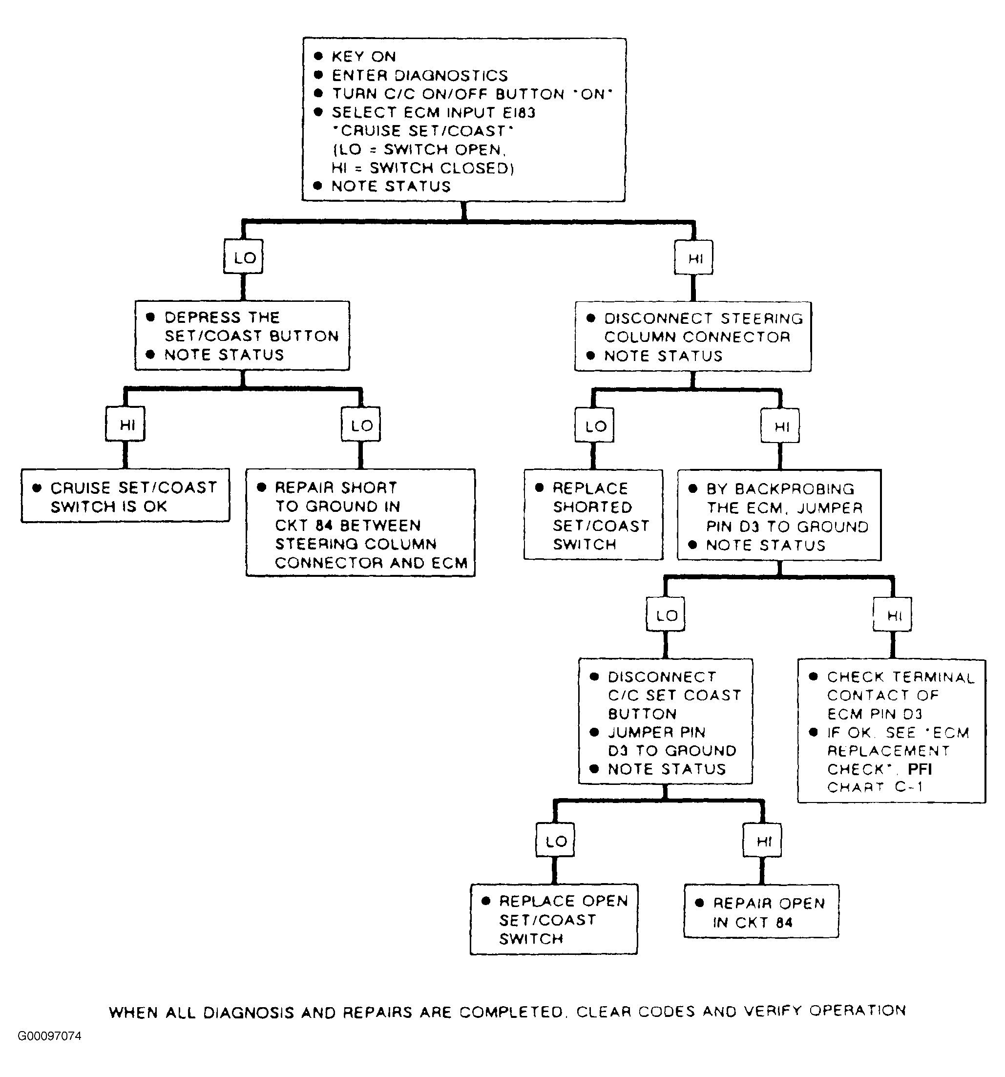 Select ECM input EI83 and observe the status light while holding set/coast button in and manipulating wiring. If the fault is induced, the status will jump from "HI" to "LO". Repair intermittent open in circuit No. 84.