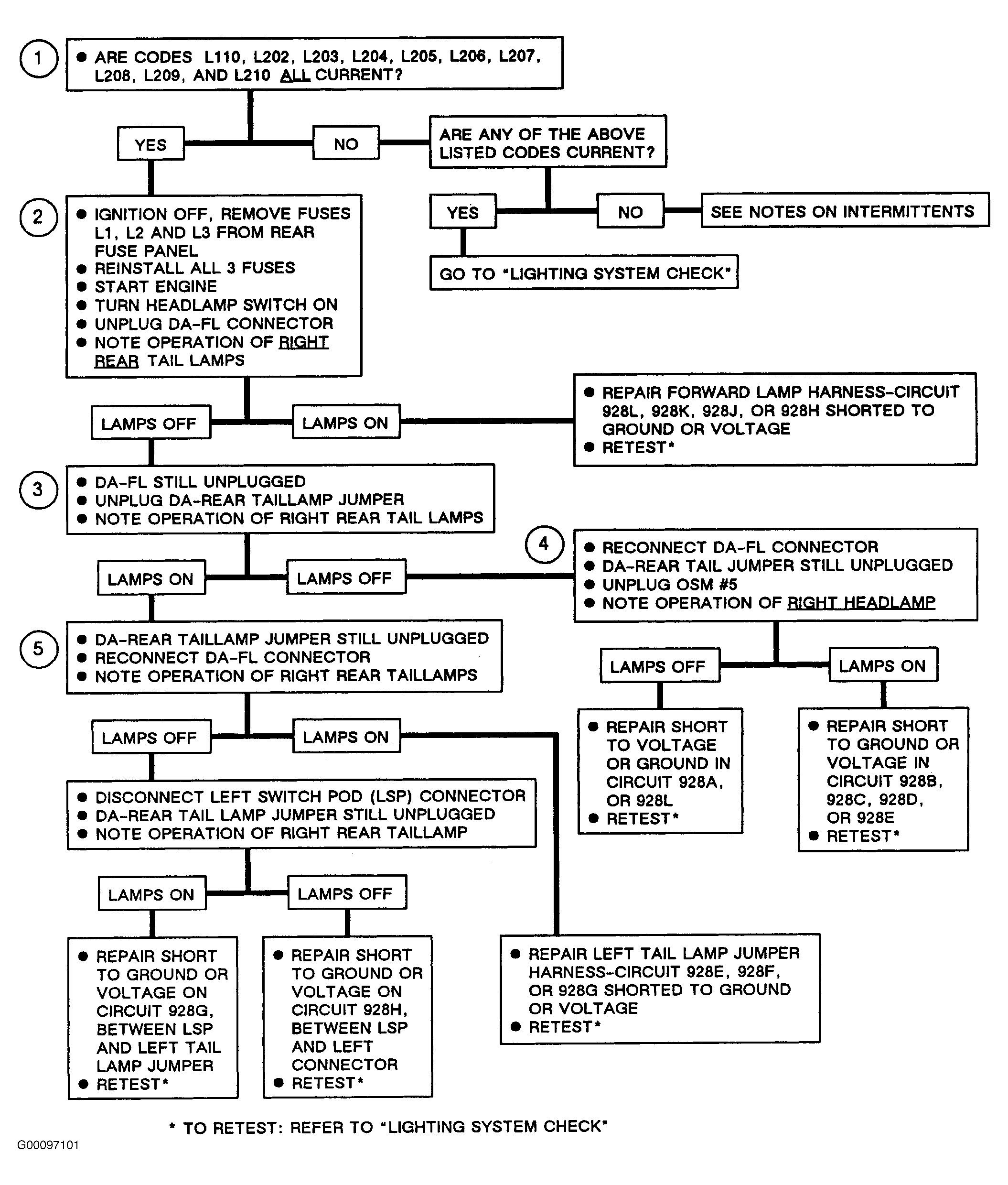 - Removing and reinstalling Fuses "L-1", "L-2" and "L-3" assures that all OSM's are reset to the "LIGHTS OFF" status. Disconnecting the dash-to-forward lamp harness connector "DA-FL" will remove the short and allow normal operation of the right rear taillamps only if the short is in the forward lamp harness.