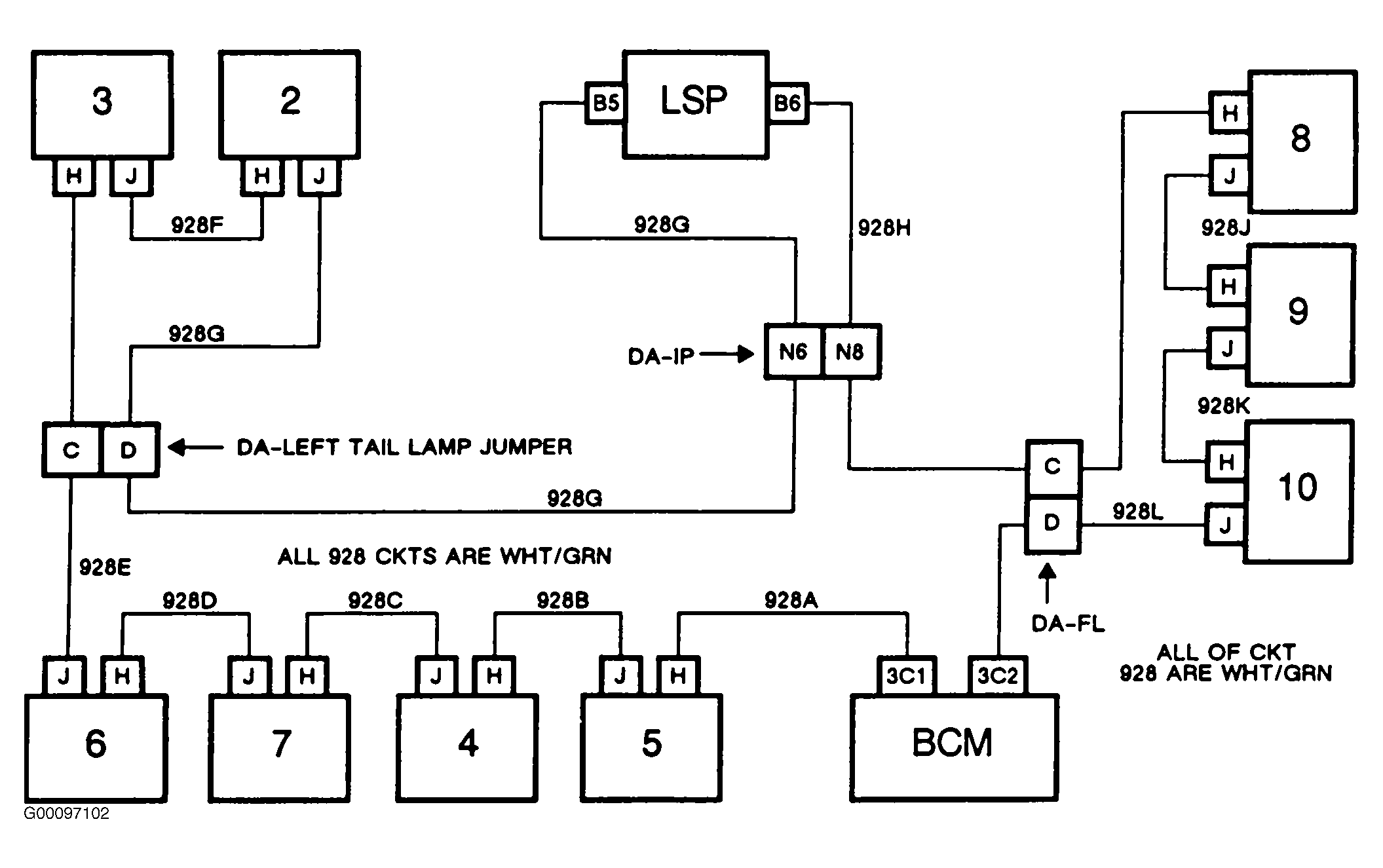 - If the right rear taillamps operate with connector "DA-FL" and the "DA-LEFT TAILLAMP JUMPER" connector removed, then the short is in the "DA-LEFT TAILLAMP JUMPER" or in circuit No. 928G or No. 928H.