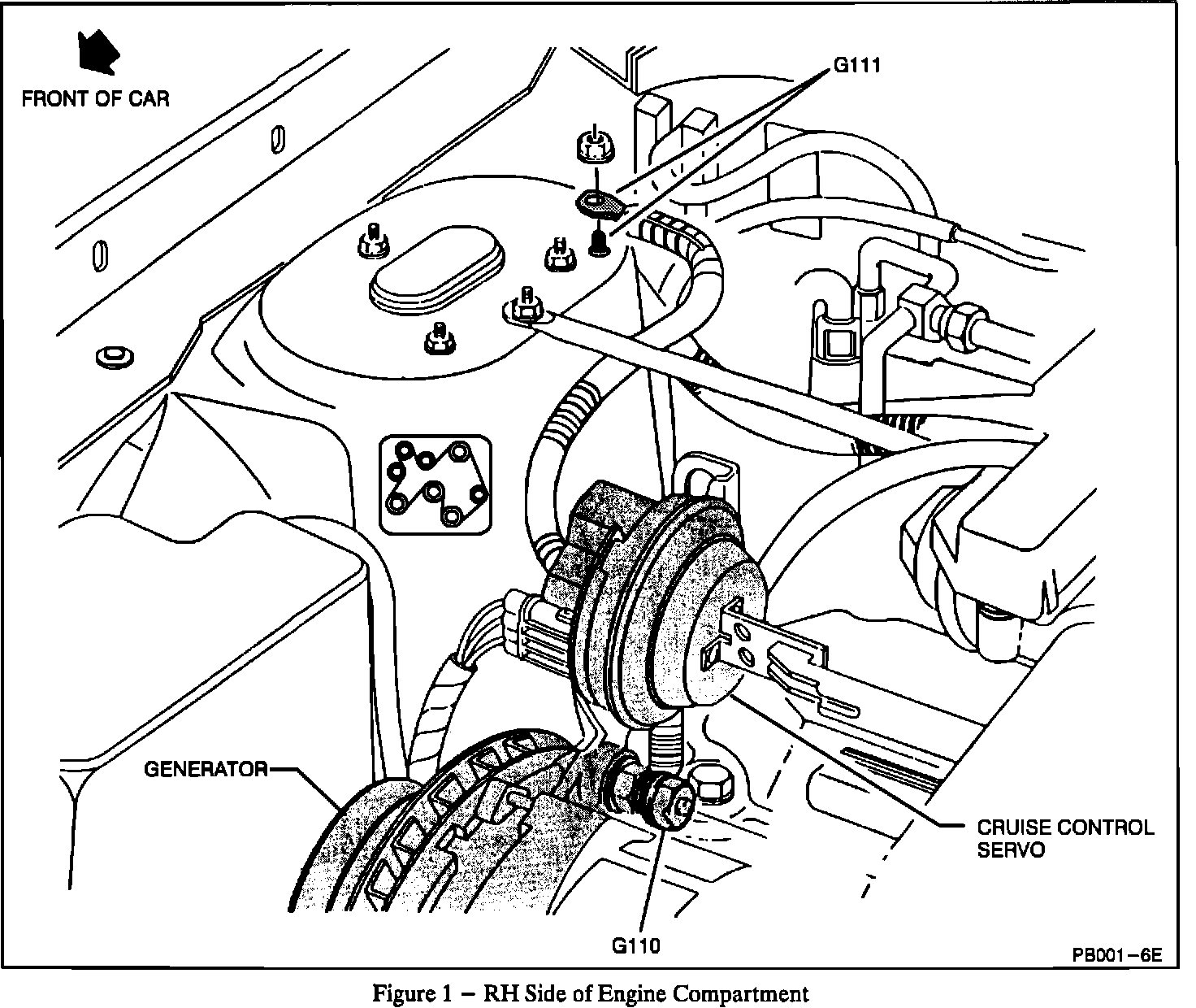 To correct this condition remove the nut and cable for G111 at the right-band shock tower. Remove any paint or primer from this area. Reinstall the cable and nut. Apply appropriate sealer to prevent corrosion. Refer to Figure 1.