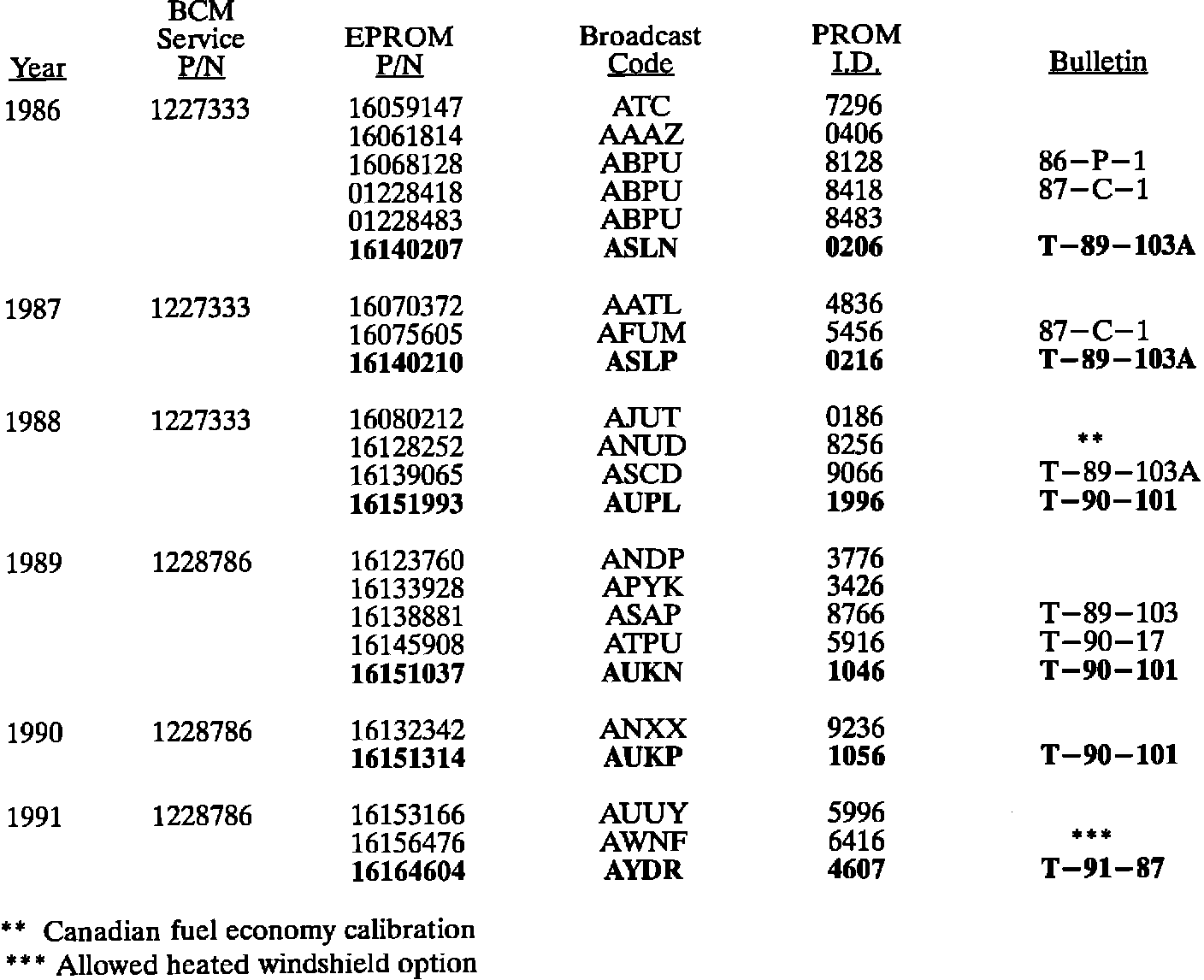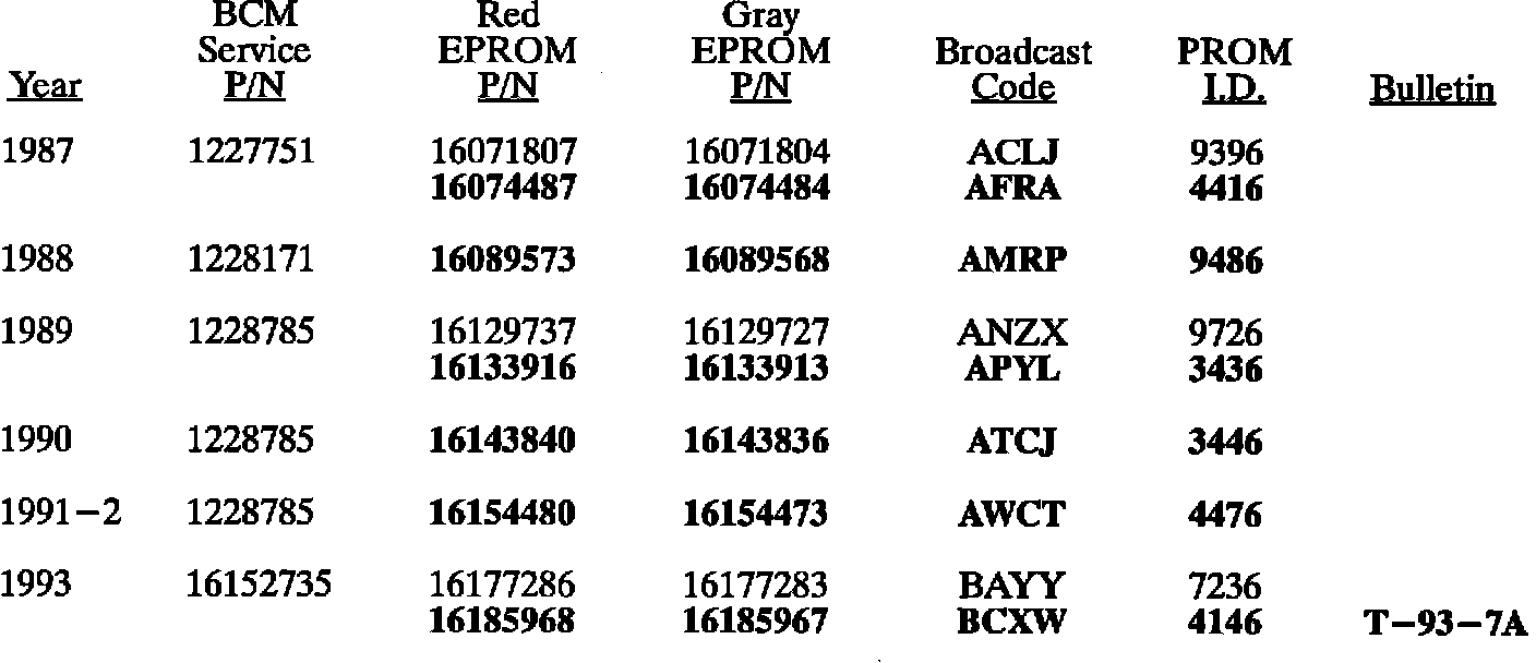 The charts summarize all of the EPROM calibrations made on 1985-1993 BCM equipped vehicles to date. When any diagnosis leads to BCM EPROM replacement, the latest service EPROM part number listed should be used. Should any additional EPROM calibration changes be made, the GMSPO parts distribution system will automatically supersede these service part numbers.