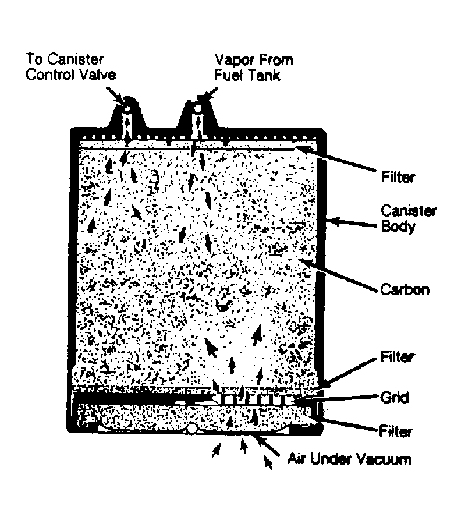 Carbon-canisters are either open or closed-bottom in design. Open-bottom canisters draw outside air into system through a filter in bottom of the canister. Some models use an electric solenoid or a thermostatically controlled vacuum valve, combined with ported vacuum, to control the canister purge function. See Fig 2 .