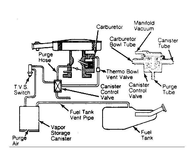 The fuel tank and carburetor fuel bowl are vented through a hose into a canister containing activated carbon. The carbon adsorbs the fuel vapors when the engine is not operating. When the engine is started, fuel vapors are drawn from the canister into the engine. See Fig 1 and Figure .