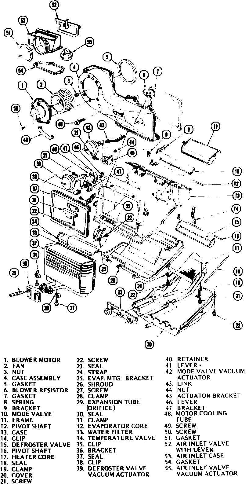 4. With vehicle lowered, remove sound insulators, glove box, steering column trim cover, and lower duct. Remove heater core cover, heater core, evaporator cover and evaporator core.