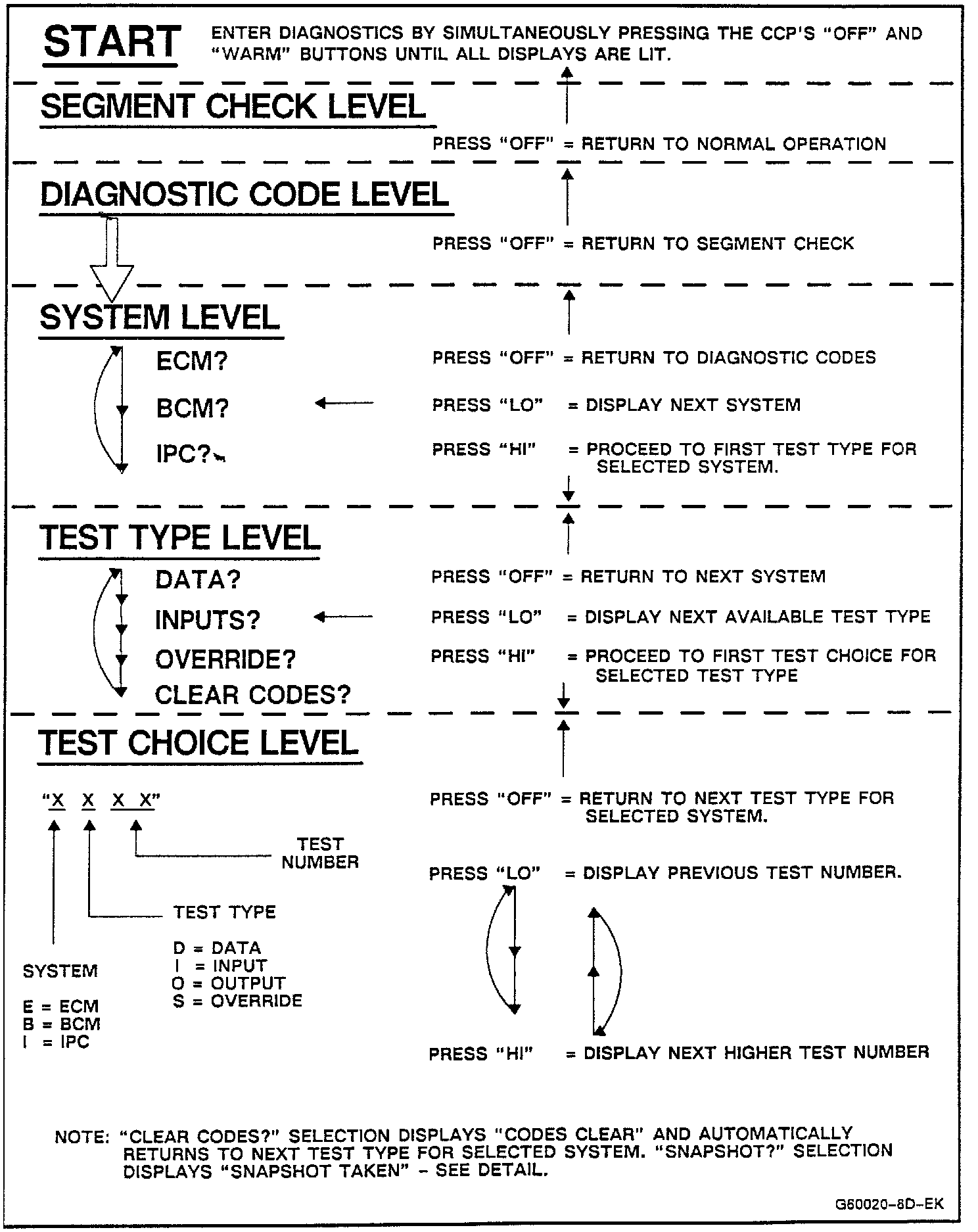 4. At any time during the display of the ECM or BCM codes, if the Lo button on the Climate Control Panel (CCP) is depressed, the display of codes will be bypassed. If the ``Reset/Recall'' button on the Driver Information Center (DIC) is depressed, the system will exit the diagnostic mode and go back to normal vehicle operation.