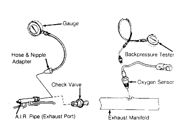 To test for restricted exhaust system, you will need a Bourroughs Exhaust Backpressure Tester (BT 8515 or BT 8603). Or if testing at Air Injection Reactor (A.I.R.) pipe, connect hose and nipple from Propane Enrichment Device (J26911) to a fuel pump pressure gauge. See Fig 1 .