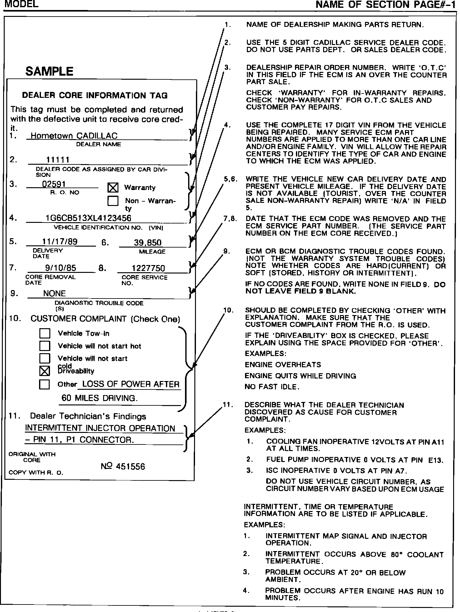 The information supplied by the tag is very important to the Remanufacturing Center. It will assist them in assuring that an intermittent, time, or temperature failure noted on the tag is thoroughly checked and repaired. This information should also be obtained for Over The Counter (OTC) sales.