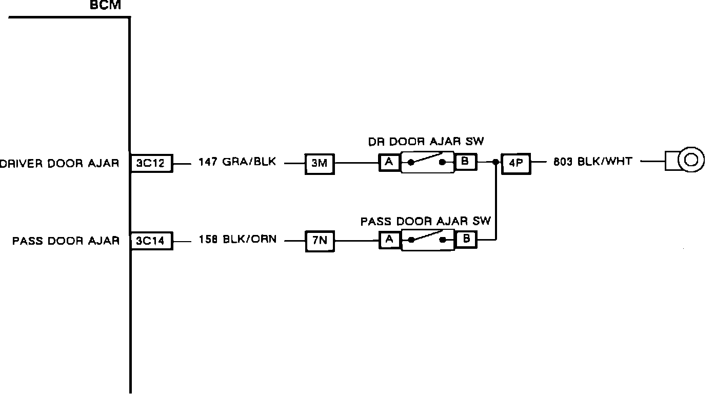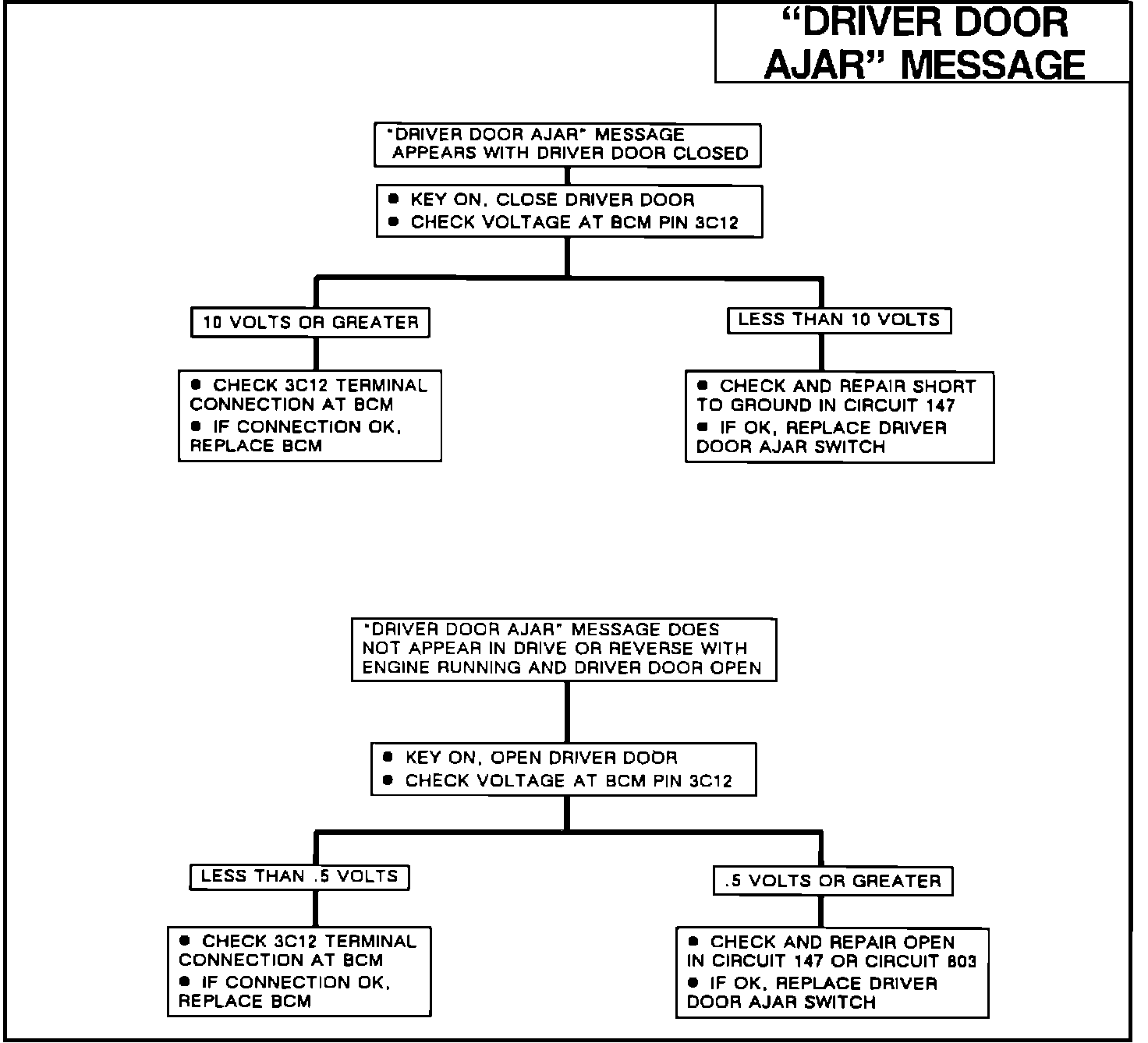 The BCM provides system voltage to the driver door ajar circuit, and the driver door ajar switch provides the single path to ground. The BCM supplies and internally monitors the voltage level of the circuit at pin 3C12. When the driver door ajar circuit is open the BCM will detect system voltage, but if the driver door ajar switch provides a path to ground (driver door open), the BCM will detect the circuit has been grounded. Once the BCM has determined that all of the failure conditions have been met, it will send the "Driver Door Ajar" message to the CCDIC.