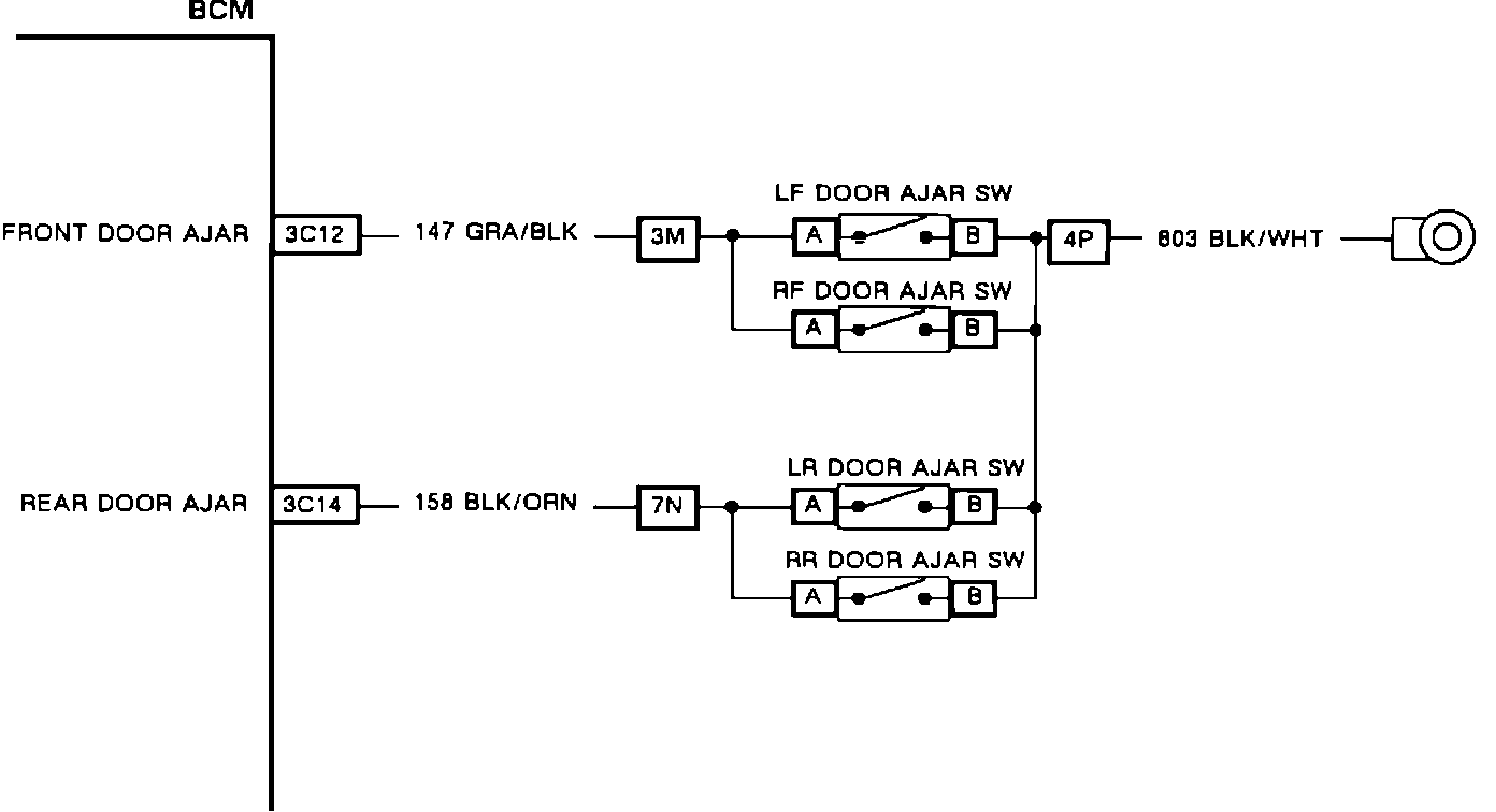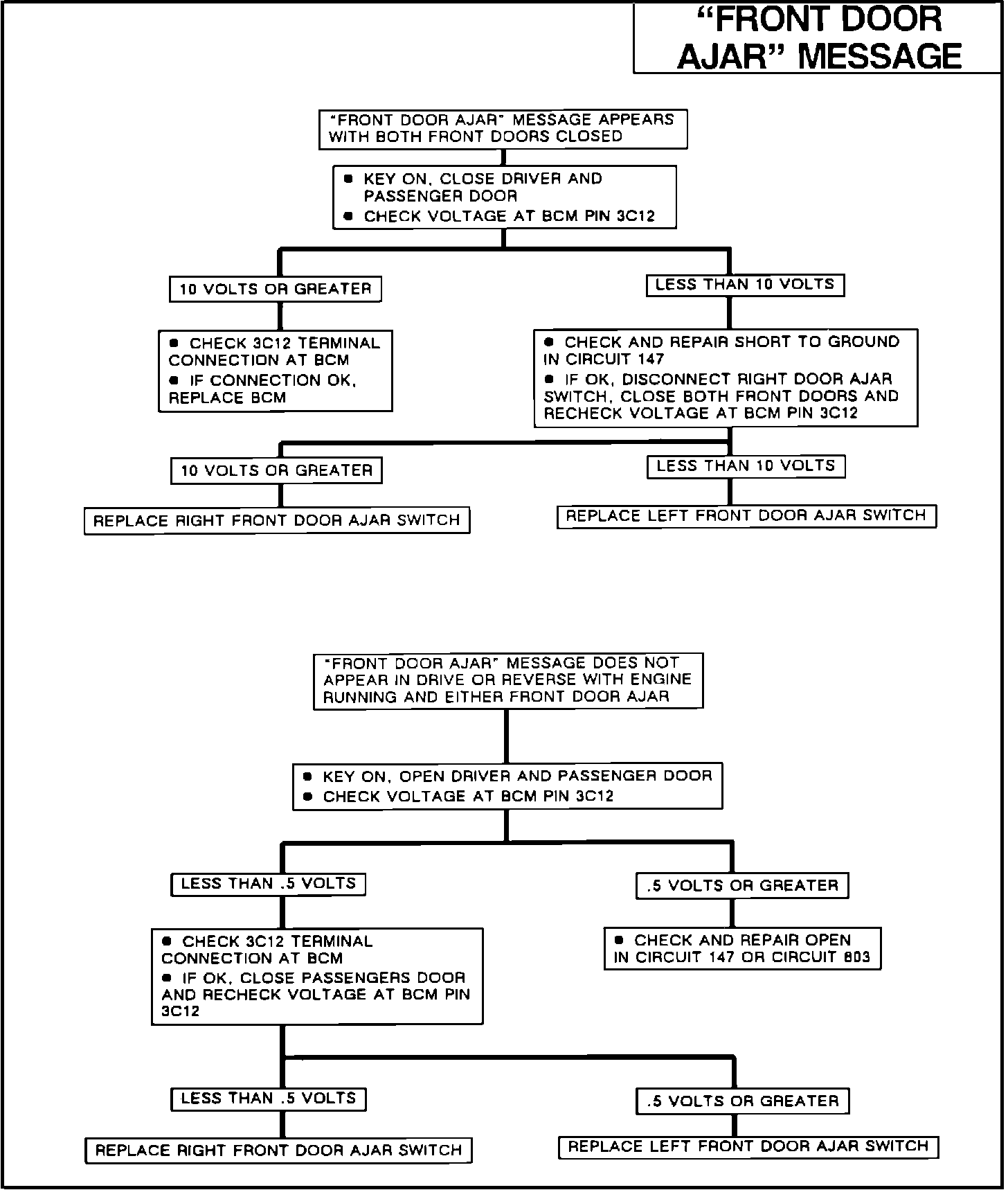 The BCM provides system voltage to the front door ajar circuit, and the left hand and right hand front door ajar switches provide two separate paths to ground. The BCM internally monitors the voltage level at pin 3C12. When the front door ajar circuit is open the BCM will detect system voltage, but if one or both switches provide a path to ground (either front door is open), the BCM will detect the circuit has been grounded. Once the BCM detects that all of the failure conditions have been met, it will send the "Front Door Ajar" message to the CCDIC.