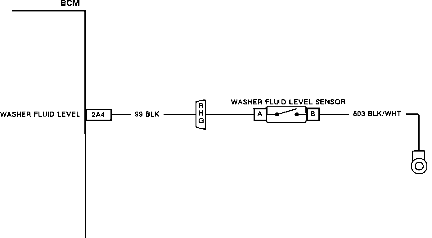 The BCM provides system voltage to the low washer fluid circuit, and the washer fluid level switch provides the single path to ground. The BCM supplies and internally monitors the voltage level of the circuit at pin 2A4. When the washer fluid level circuit is open the BCM will detect system voltage, but if the washer fluid level switch provides a path to ground (low washer fluid condition present), the BCM will detect low voltage. If this condition exists for at least 15 seconds, the BCM will send the "Washer Fluid Low" message to the CCDIC.