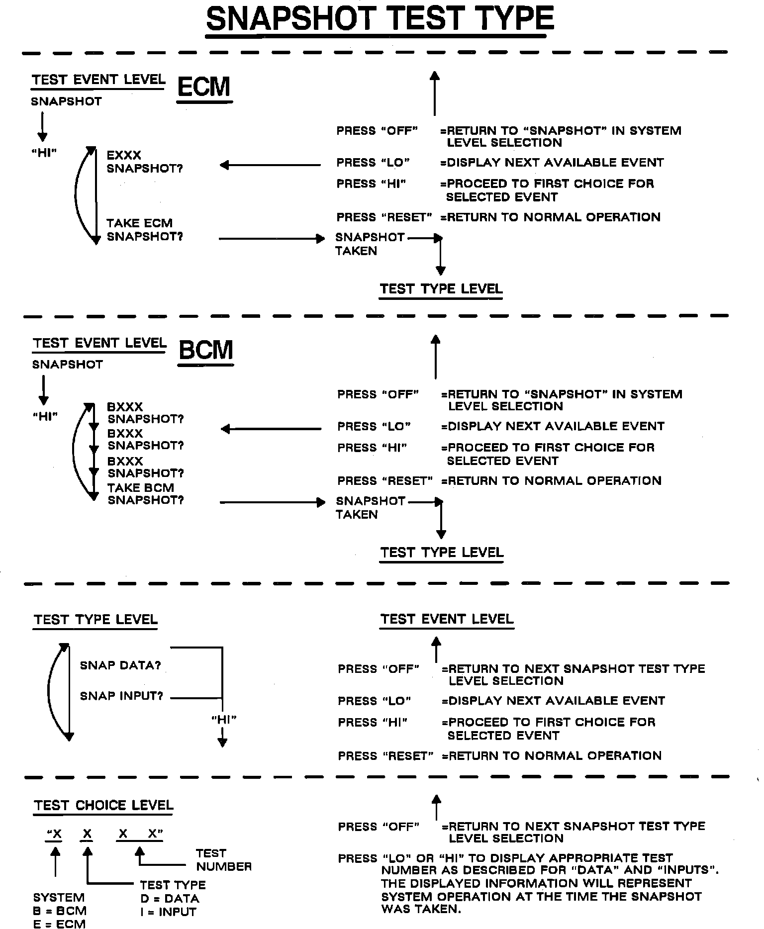 Selection of the "SNAPSHOT?" test type while in the BCM system level will allow the recall of up to three snapshots recorded at the time of the setting of BCM malfunction codes. Additionally, one may trigger the recording of a snapshot upon demand. Selecting snapshot (by pushing the "HI" button) while in the BCM system, will result in the display of "BXXX" where "XXX" is the 3 digit diagnostic code that recorded the snapshot.