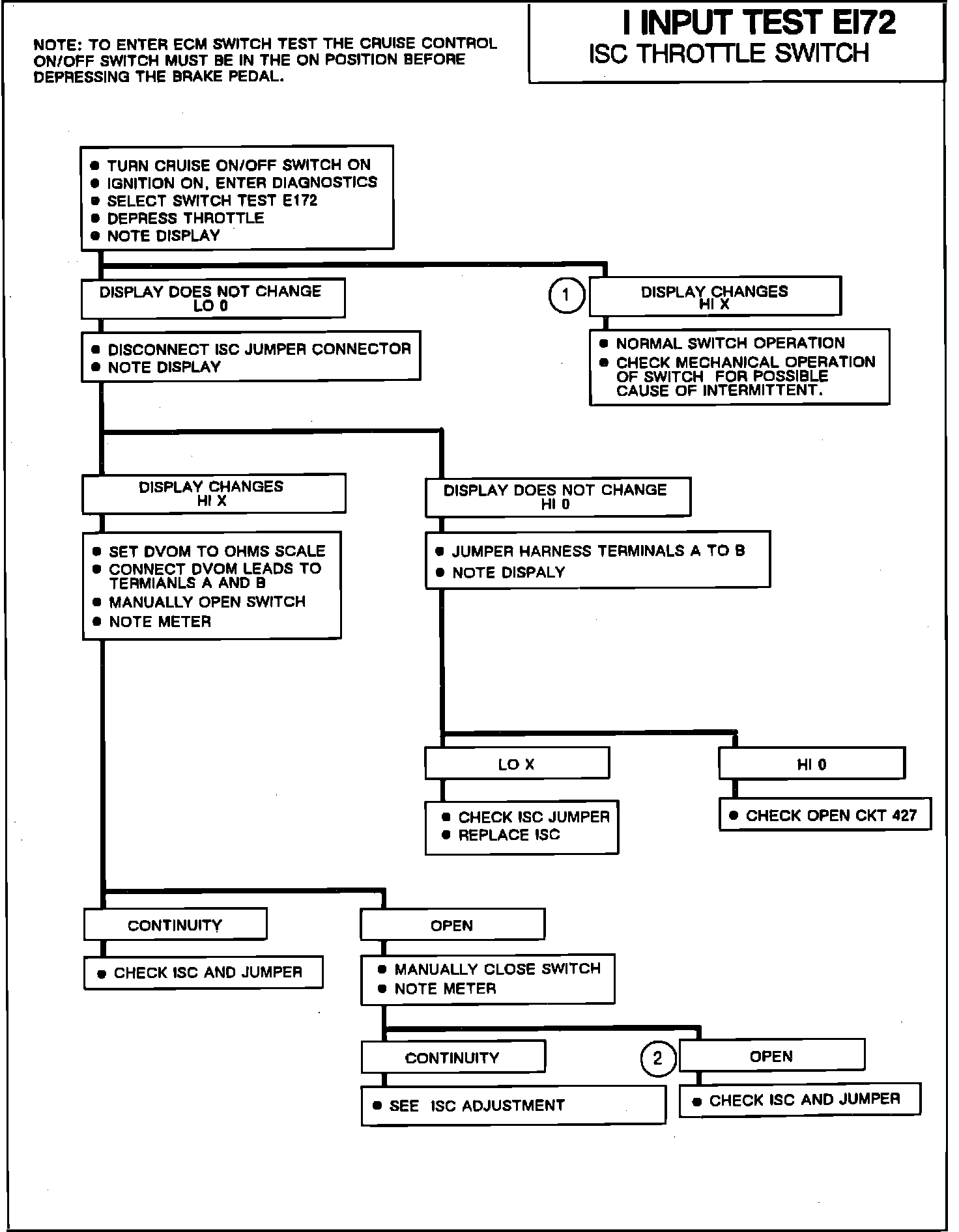 After the diagnostic trouble codes have been displayed, the Driver Information Center (DIC) will display "ECM?". Depress the HI blower button. The display will change to read PCM/ECM data. Depress the LO blower button. The display will change to read PCM/ECM inputs. Depress the HI blower button. The display will change to read C/C BRAKE EI70. Depress the LO blower button twice. The display will change to read LO 0 THROTTLE EI72. When the brake pedal is depressed and released the display will change to read HI X. The change from 0 to X indicates that the test has been successfully completed.