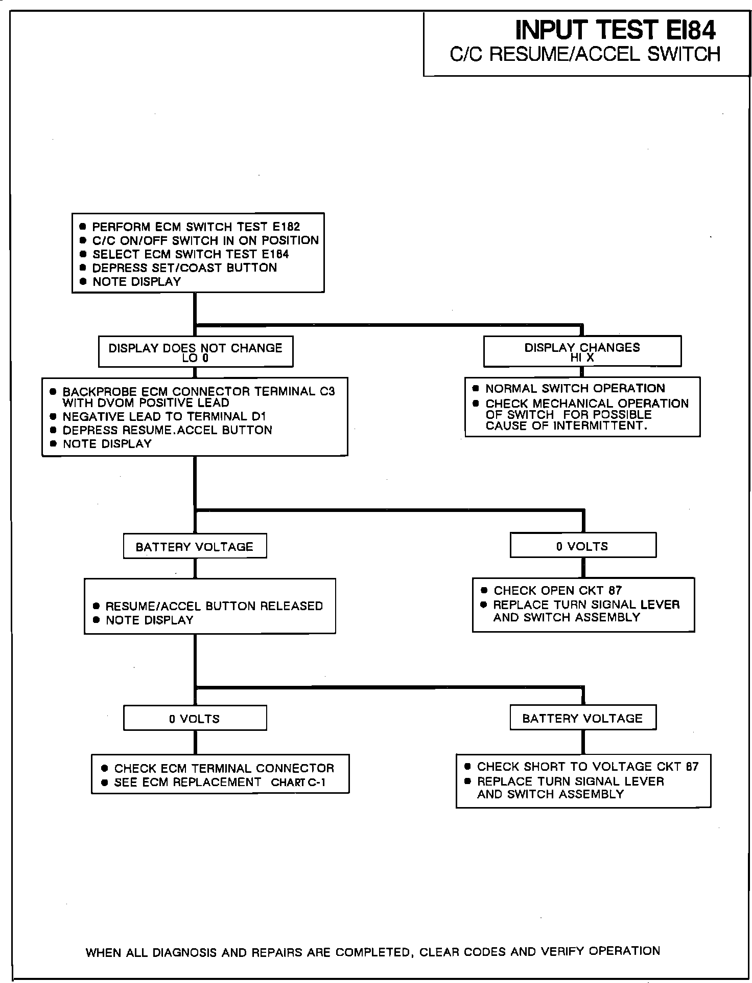 After the diagnostic trouble codes have been displayed, the Driver Information Center (DIC) will display "ECM?". Depress the HI blower button. The display will change to read PCM/ECM data. Depress the LO blower button. The display will change to read PCM/ECM inputs. Depress the HI blower button. The display will change to read C/C BRAKE EI70. Place the cruise control ON/OFF switch in the ON position. Depress the LO blower button six times. The display will change to read LO 0 C/C RES/AC EI84. When the cruise control RESUME/ACCEL switch is depressed the display will change to read HI X. The change from 0 to X indicates that the test has been successfully completed.