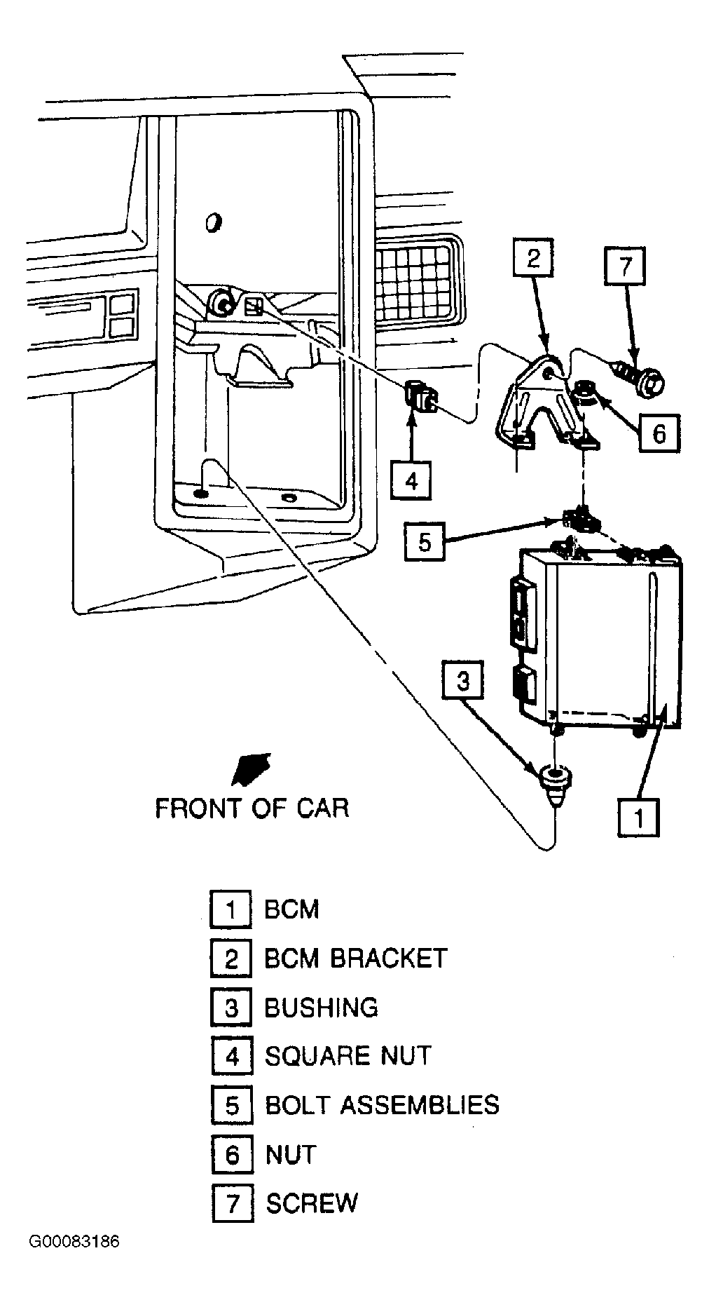 - Remove retaining screw and pull BCM and mounting bracket out of cavity. See Fig 1 .