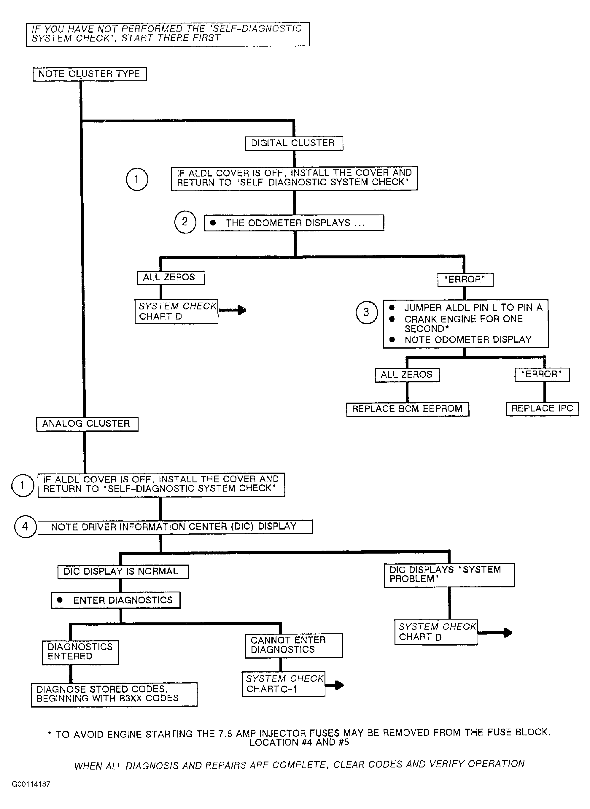 Home >> Cadillac >> 1991 >> Allante F7/ME9 >> Repair and Diagnosis >> Body & Frame >> Body, Cab Control Systems >> Body Computer Module >> Self Diagnostics System Check >> Chart A: Cluster Display Problem