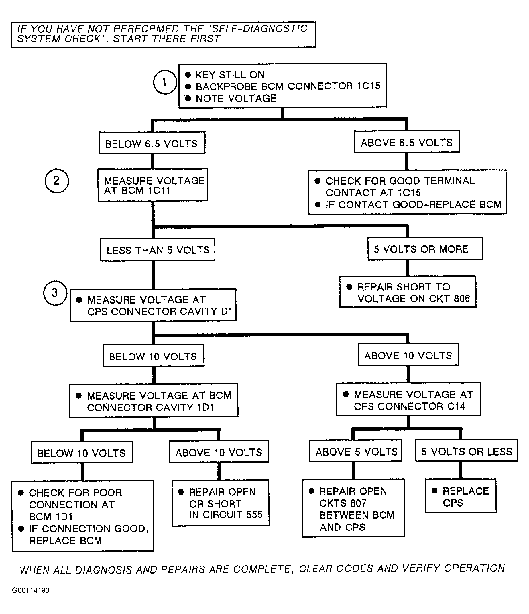 3. With the key in the run position, the BCM should "Wake-Up" the CPS with a greater than 10 volt signal to the CPS on circuit 555. If this voltage is there, the problem must be a poor connection at the CPS. If there is no voltage, then the wire or BCM are suspect.