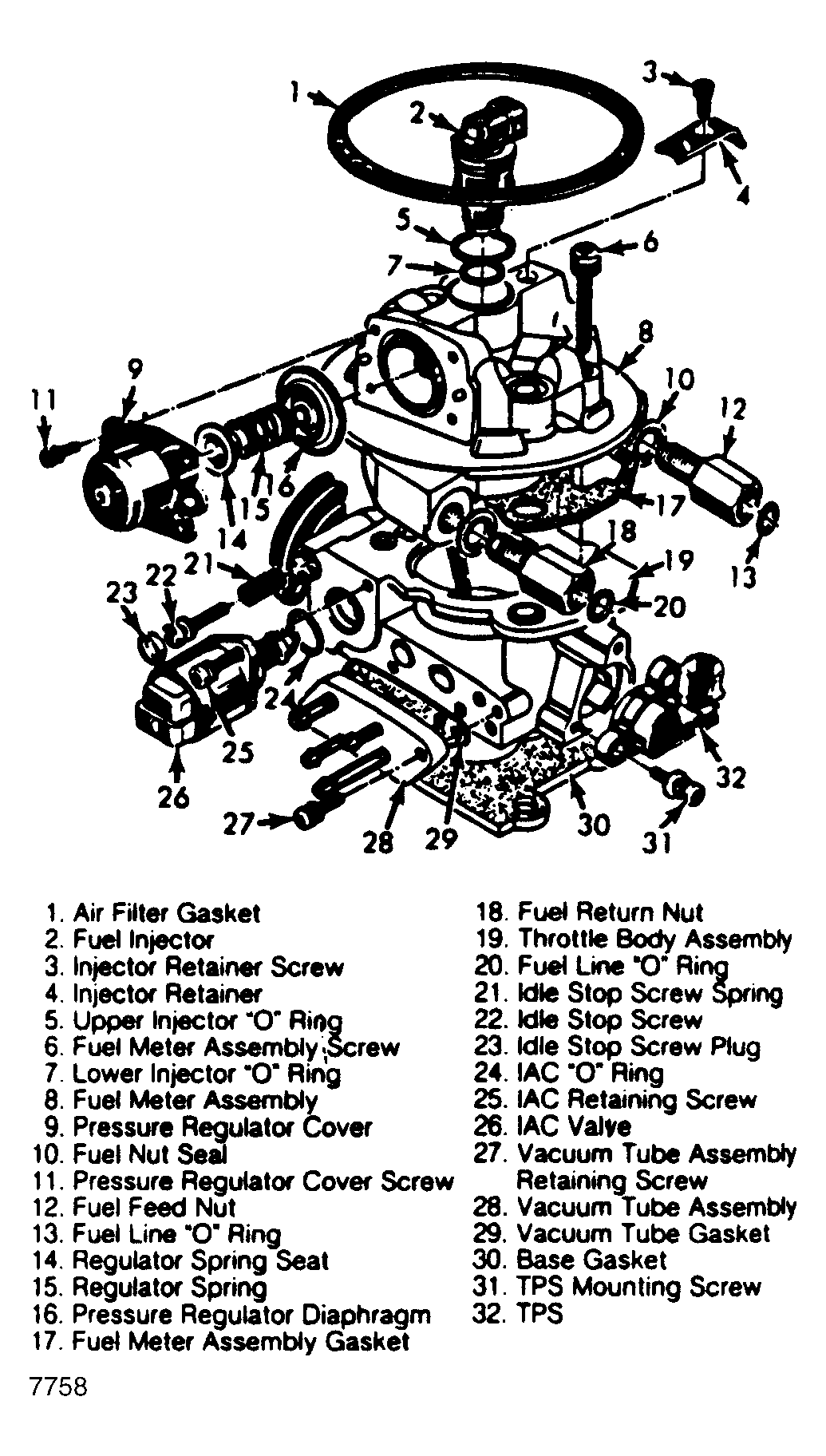 Remove fuel meter-to-throttle body retaining screws. Remove fuel meter assembly. See Fig 1 . Discard gasket. If fuel pressure regulator cover is removed, replace regulator diaphragm to prevent fuel leaks. Remove TPS and IAC assembly. Throttle valve screws are staked in position and should not be removed.