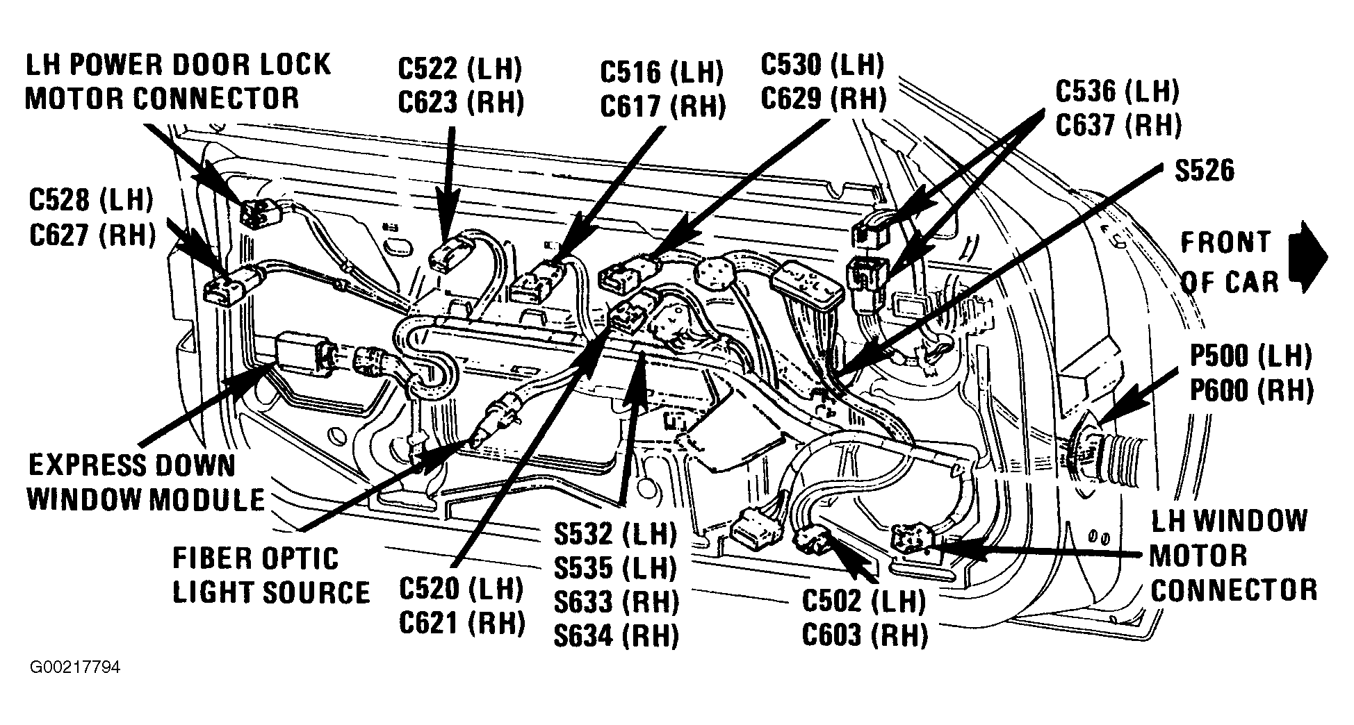 Body main harness, in LH front door, ten inches from power window switch. See Fig 1 |