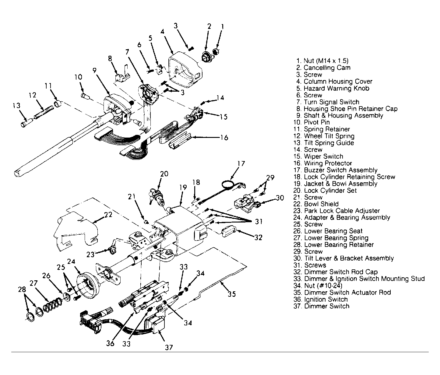 Columns have a 2-piece telescoping gear shift tube (column shift), connected by plastic inserts and shear pins. A 2-piece telescoping steering shaft features upper and lower sections, connected by plastic collars and pins. Steering columns use an integral ignition lock switch. This lock secures the steering wheel and shift linkage (column shift).