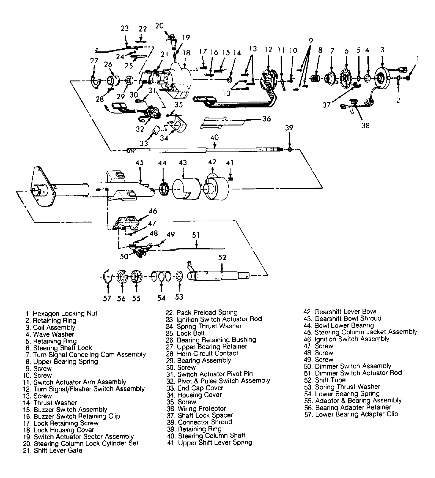 Steering columns are either floor shift or column shift. Column shift and floor shift steering columns are each available in 3 configurations: fixed column, tilt column and tilt/telescopic column. Design and maintenance of column shift and floor shift columns are similar. Column shift models, however, include an additional shift lever, shift tube, tilt or tilt/telescopic mechanism and related components. See Figure-Figure.