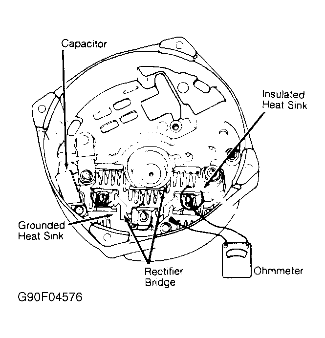 - Repeat test between insulated heat sink and its 3 flat rectifier bridge metal connectors. Replace rectifier bridge if test readings are the same when leads are reversed at any test connection.