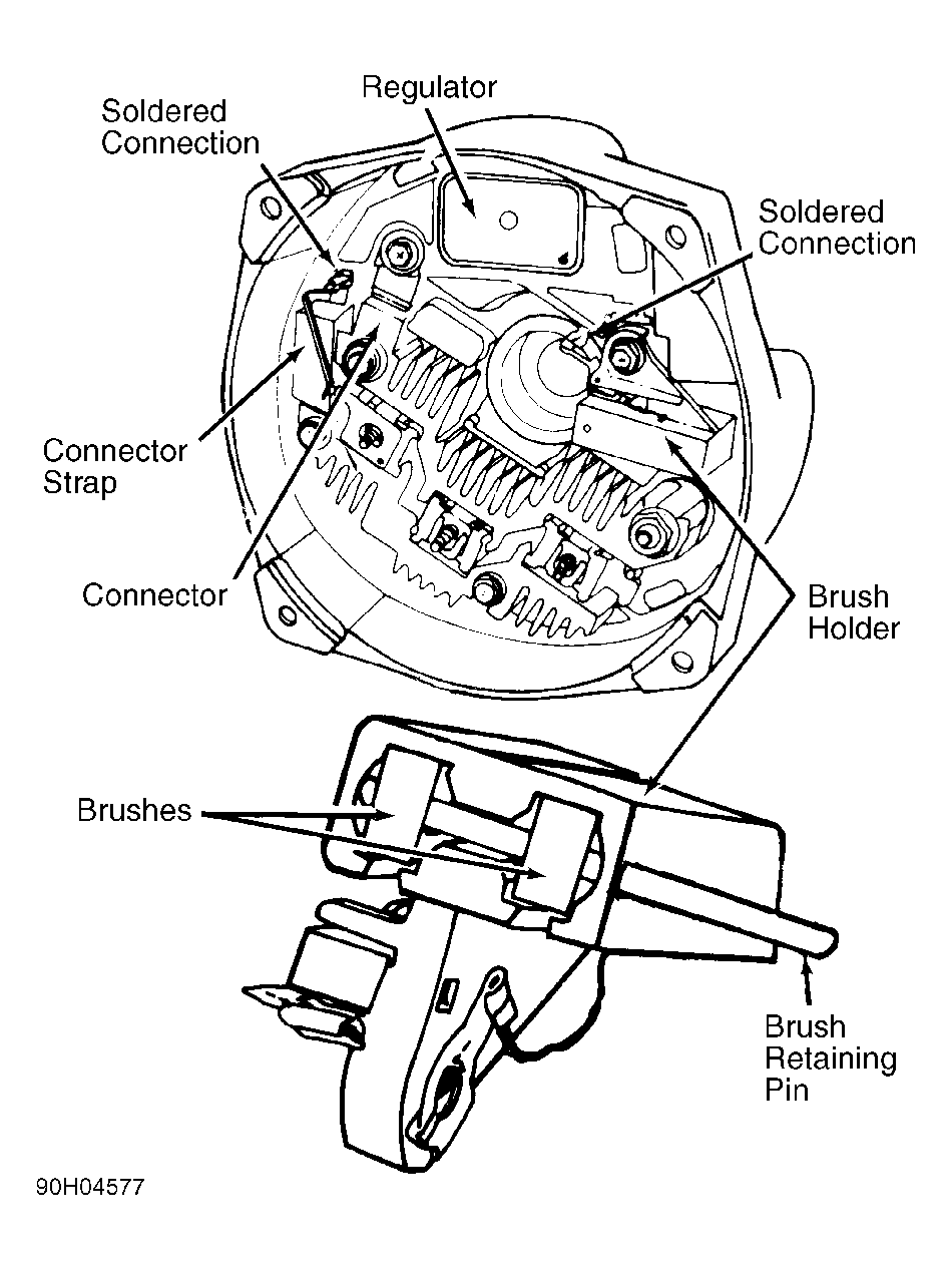 - To reassemble alternator, reverse disassembly procedure. Retain brushes with brush retaining pin during reassembly. See Figure. Remove retaining pin after tightening through bolts.