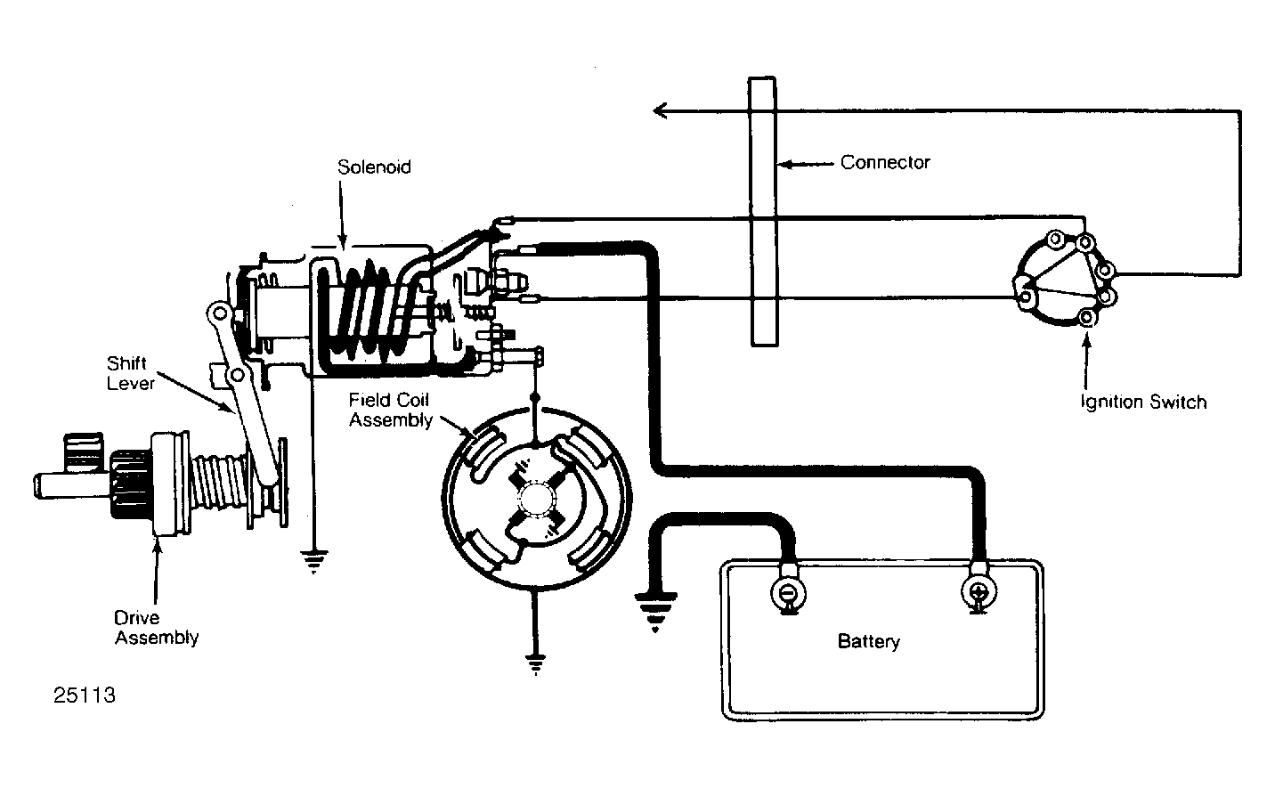 The Delco-Remy starter is part of the cranking circuit, which also consists of the battery, ignition switch and related wiring. See Fig 1. When the ignition switch is turned to the START position, the starter solenoid windings are energized. This causes the solenoid plunger to move the shift lever, which engages the pinion with the engine flywheel ring gear. The movement of the plunger also closes the main solenoid contacts, applying battery voltage to the starter.