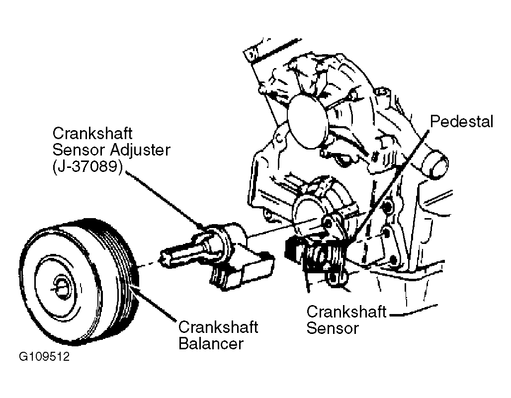 1. Loosely install sensor on pedestal. Position sensor with pedestal attached onto Installer (J-37089). See Fig 1. Position installer onto crankshaft.