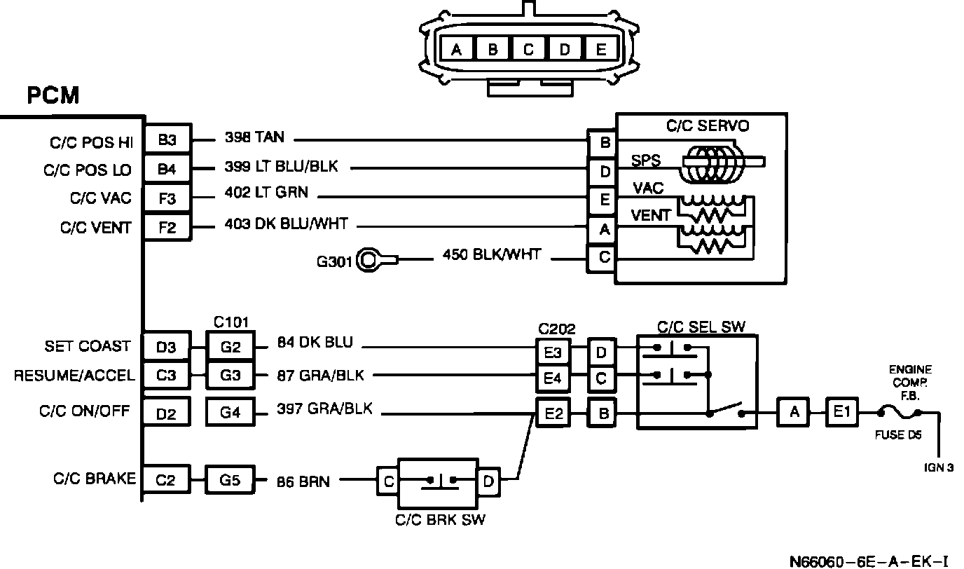 This test detects the close of the RESUME/ACCEL power switch in the turn signal lever at terminal C3 of the PCM.