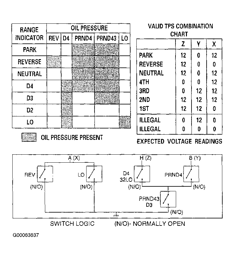 To monitor TPS operation, PCM/TCM compares voltage values it sees to a TPS combination chart stored in its memory. If PCM/TCM does not recognize TPS switch sequence (voltage sequence) for range selected, a Code 028 will result.