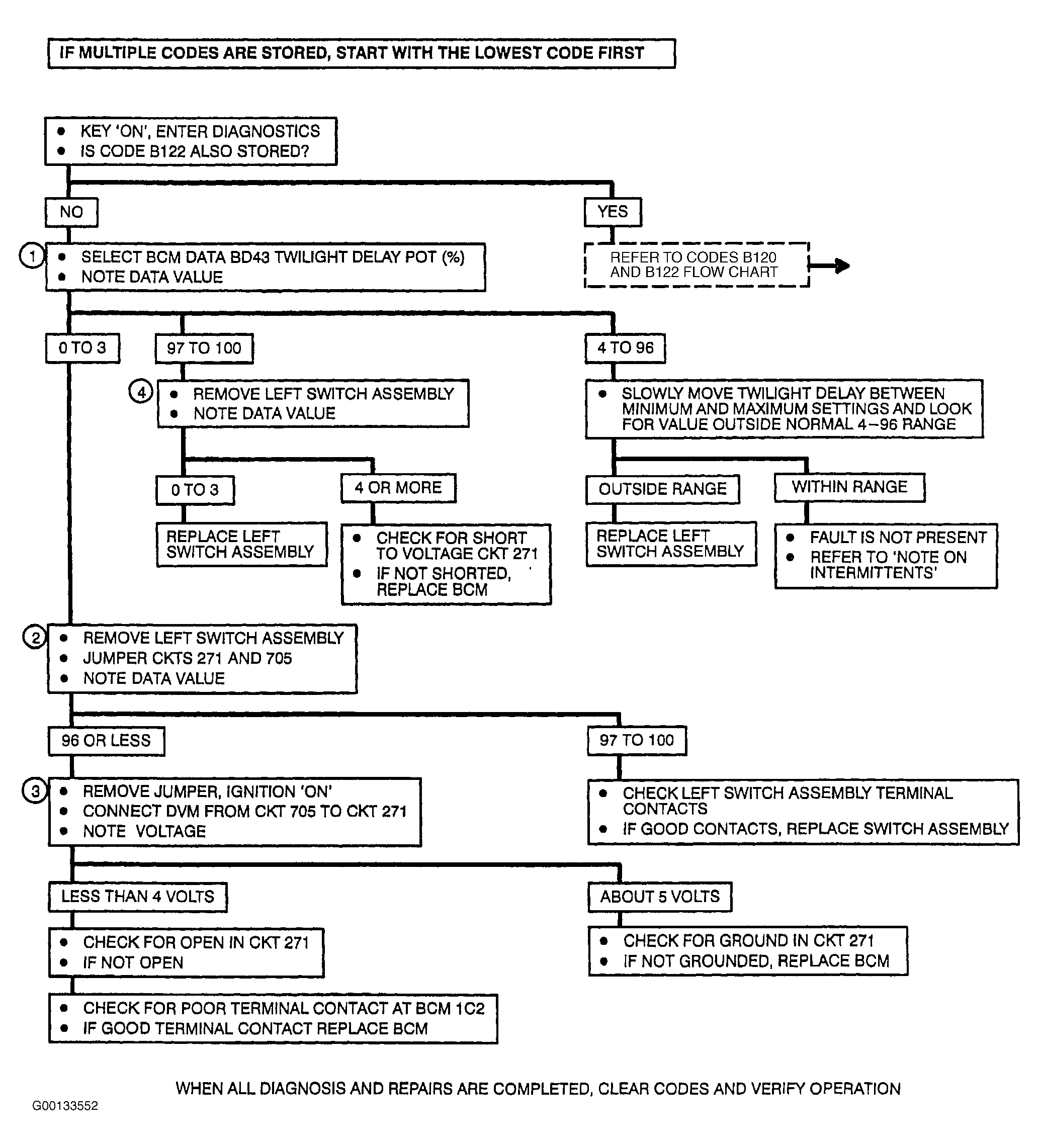 - Check to see if the open or grounded circuit reading is due to the circuit or the switch assembly. If the open or grounded circuit reading changes to a short to voltage reading after jumpering the switch assembly terminals, the BCM and wiring are OK.