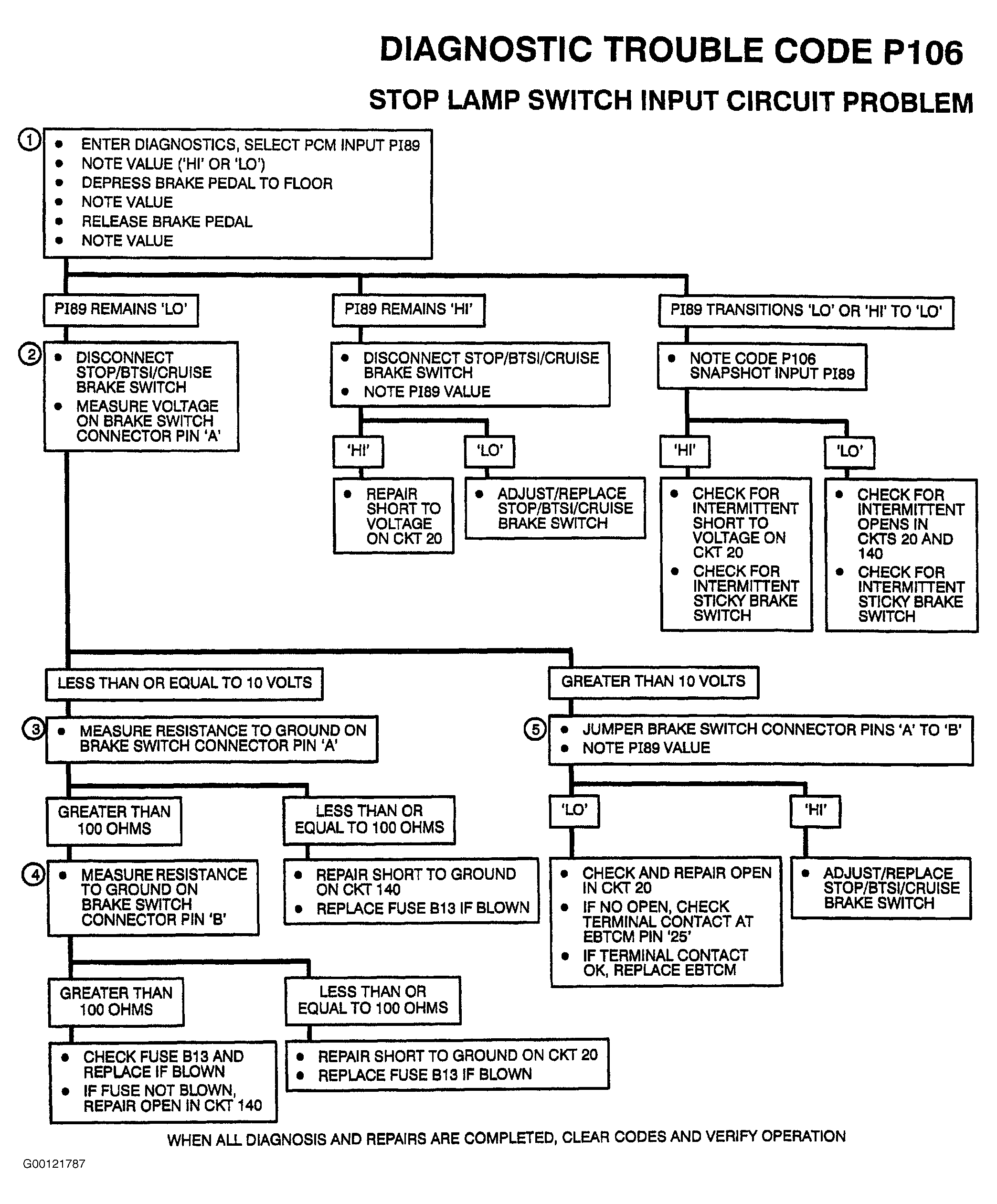 - Checking if PCM input test PI89 will cycle when brake pedal is depressed and released. If PI89 remains "HI", check for a short to voltage in the system. If PI89 remains "LO", check for an open or short to ground in the system.