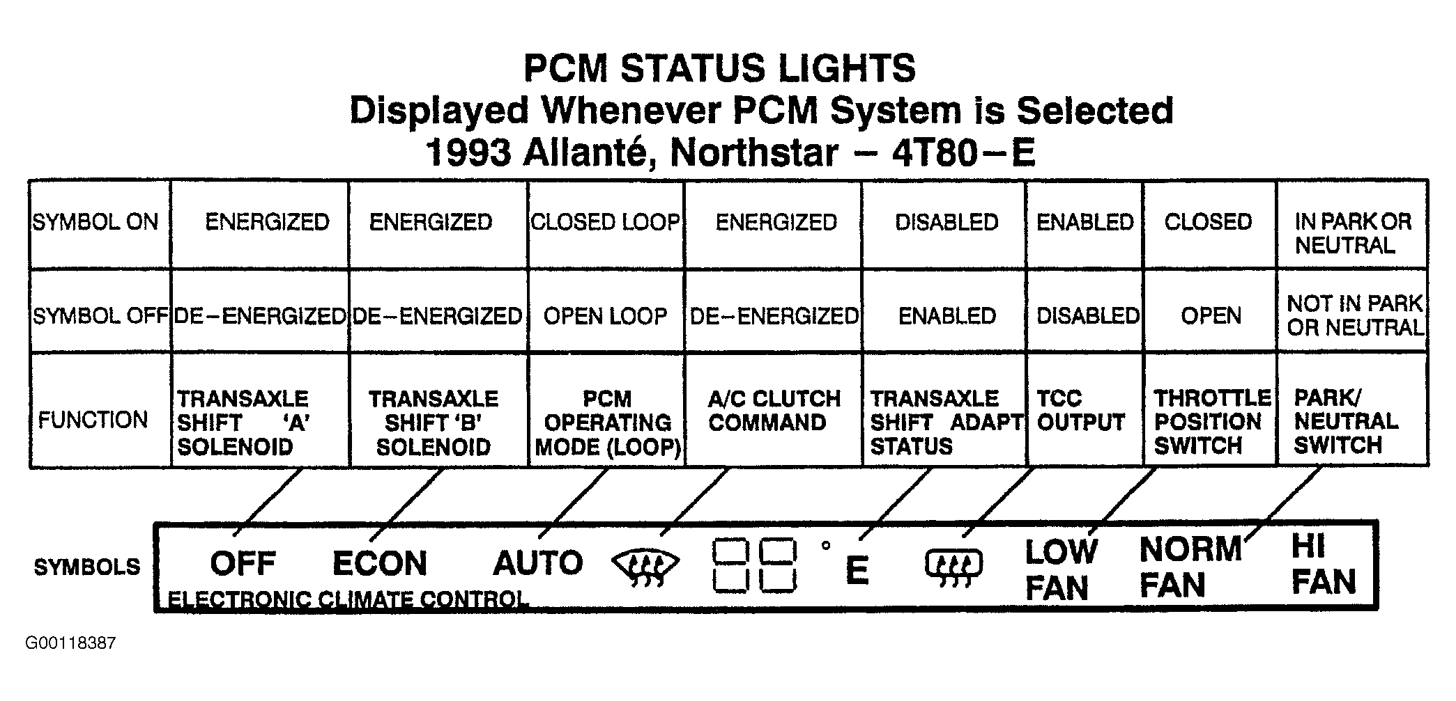 As soon as "PCM?" is selected, the Electronic Climate Control (ECC) panel begins display of PCM Status Lights. PCM Status Lights will continue to be displayed until PCM diagnostic functions are exited. PCM Status Lights show the current state of certain discrete PCM inputs and outputs by turning on or off certain indicators on the ECC panel. See Fig 1.