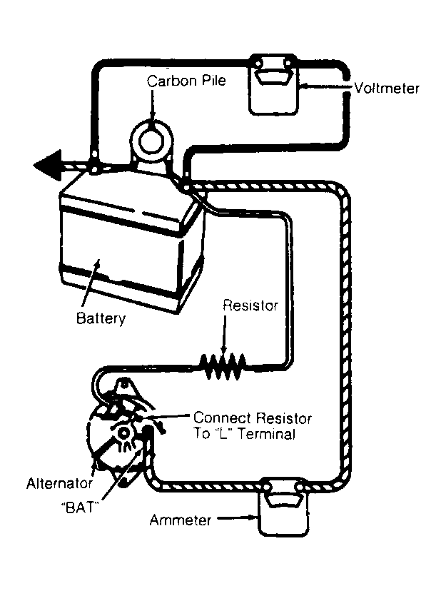 - Mount alternator on test stand. Set test stand controls to turn alternator clockwise. Ensure ground polarity of alternator and battery are the same. Ensure battery is fully charged. Connect voltmeter, ammeter and carbon pile (in the OFF position). Connect a 30-500 ohm resistor between battery and terminal "L" of alternator. See Fig 1.