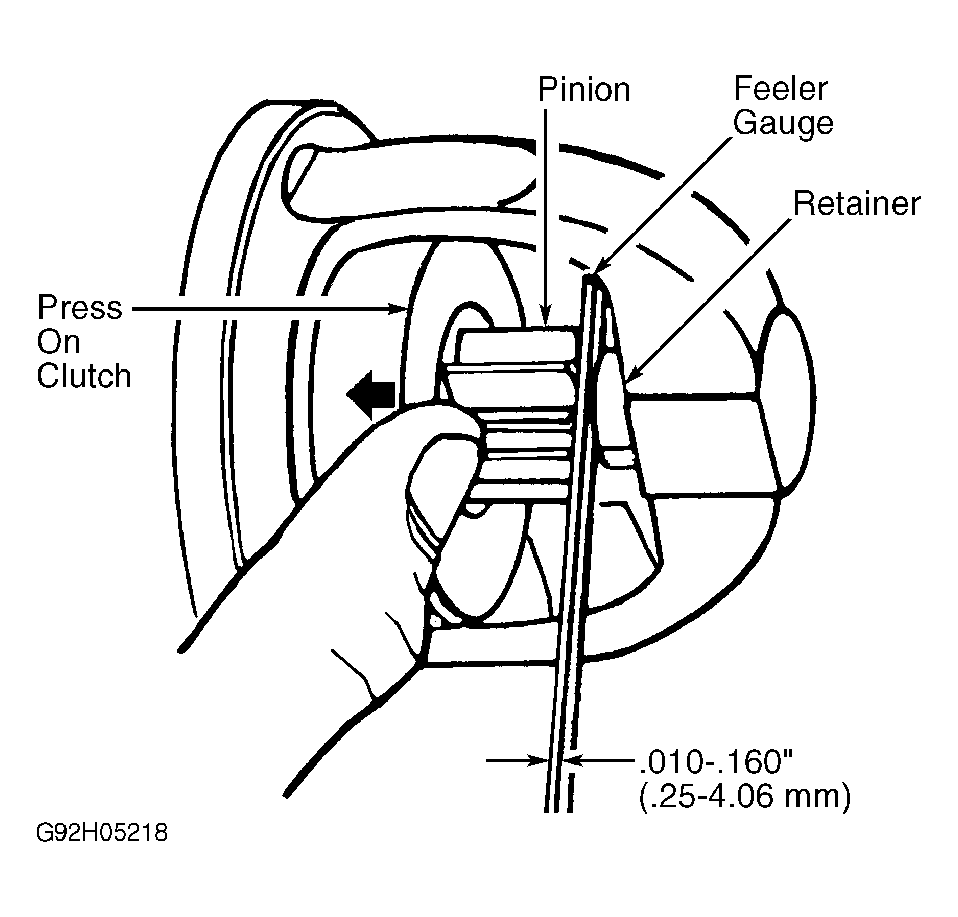 2. Push pinion as far as possible away from retainer. Using a feeler gauge, ensure there is .010-.160" (.25-4.06 mm) clearance between pinion and retainer. See Fig 1 .