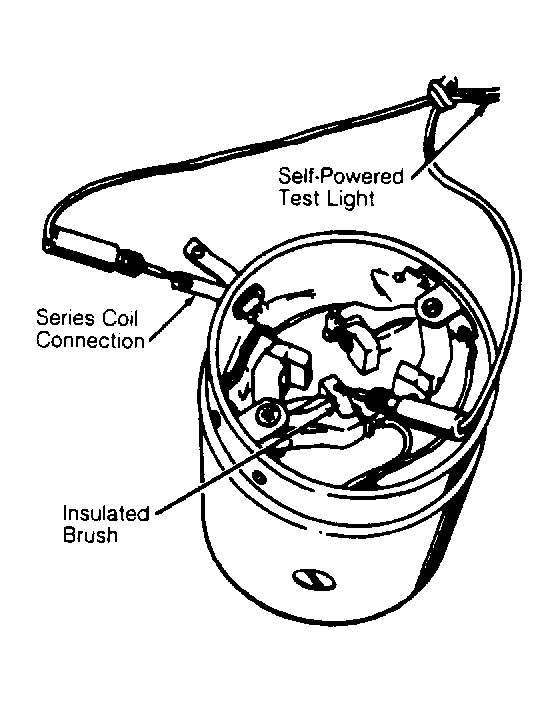 Using self-powered test light, place one lead on series coil terminal connection and other lead on insulated brush. See Fig 1 . If test light fails to illuminate, series coil is open and requires repair or replacement. Repeat test for each insulated brush.