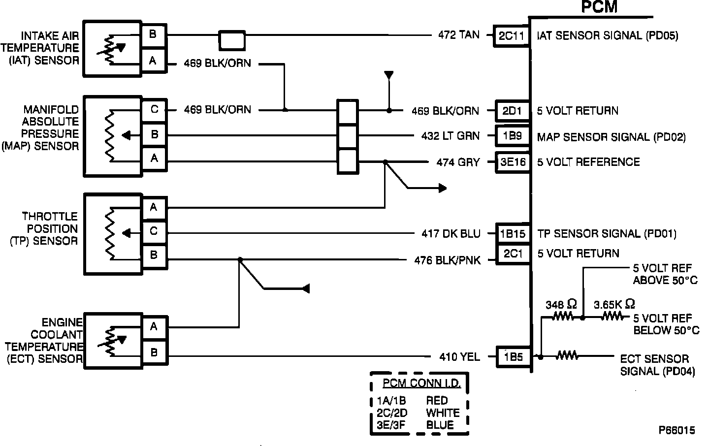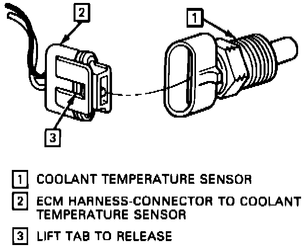The coolant sensor is a two wire component which receives a reference voltage signal from the PCM/ECM. Low coolant temperature produces a high resistance, while a high temperature produces low resistance. The PCM/ECM supplies a voltage signal to the coolant sensor through a resistor in the PCM/ECM and measures the signal voltage output. The voltage will be high when the engine is cold, and the voltage will be low when the engine is hot.