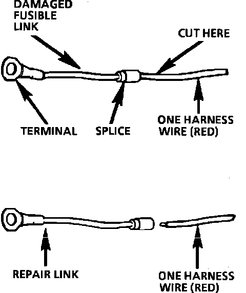 To replace a damaged fusible link which feeds two harness wires, cut them both off beyond the splice. Use two repair links, one spliced to each harness wire, Fig. 5.