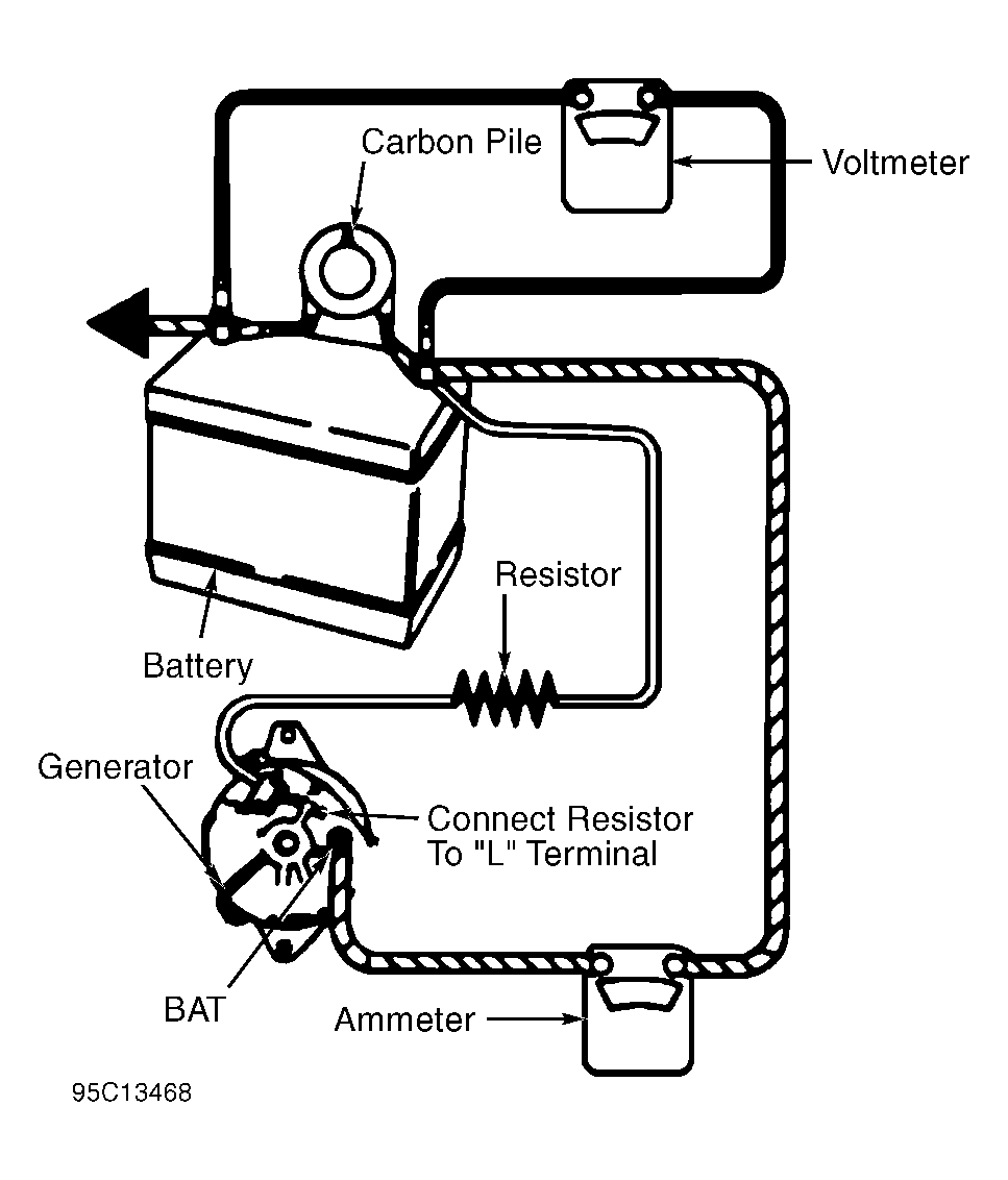 - Mount generator on test stand. Set test stand controls to turn generator clockwise. Ensure ground polarity of generator and battery are the same. Ensure battery is fully charged. Connect voltmeter, ammeter and carbon pile (in OFF position). Connect 30-500 ohm resistor between battery and terminal "L" of generator. See Fig 1.