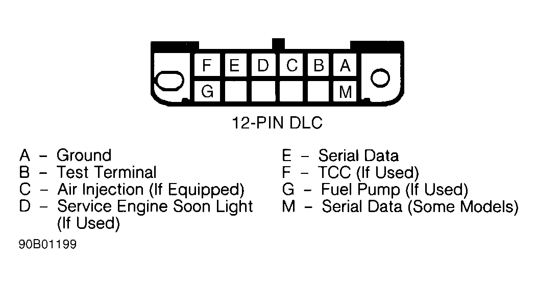 NOTE: On vehicles equipped with 16-pin DLC or 12-pin DLC without test terminal "B", use of Tech 1 scan tester is required to perform diagnostic circuit check. See DATA LINK CONNECTOR (DLC) TEST TERMINALS table.