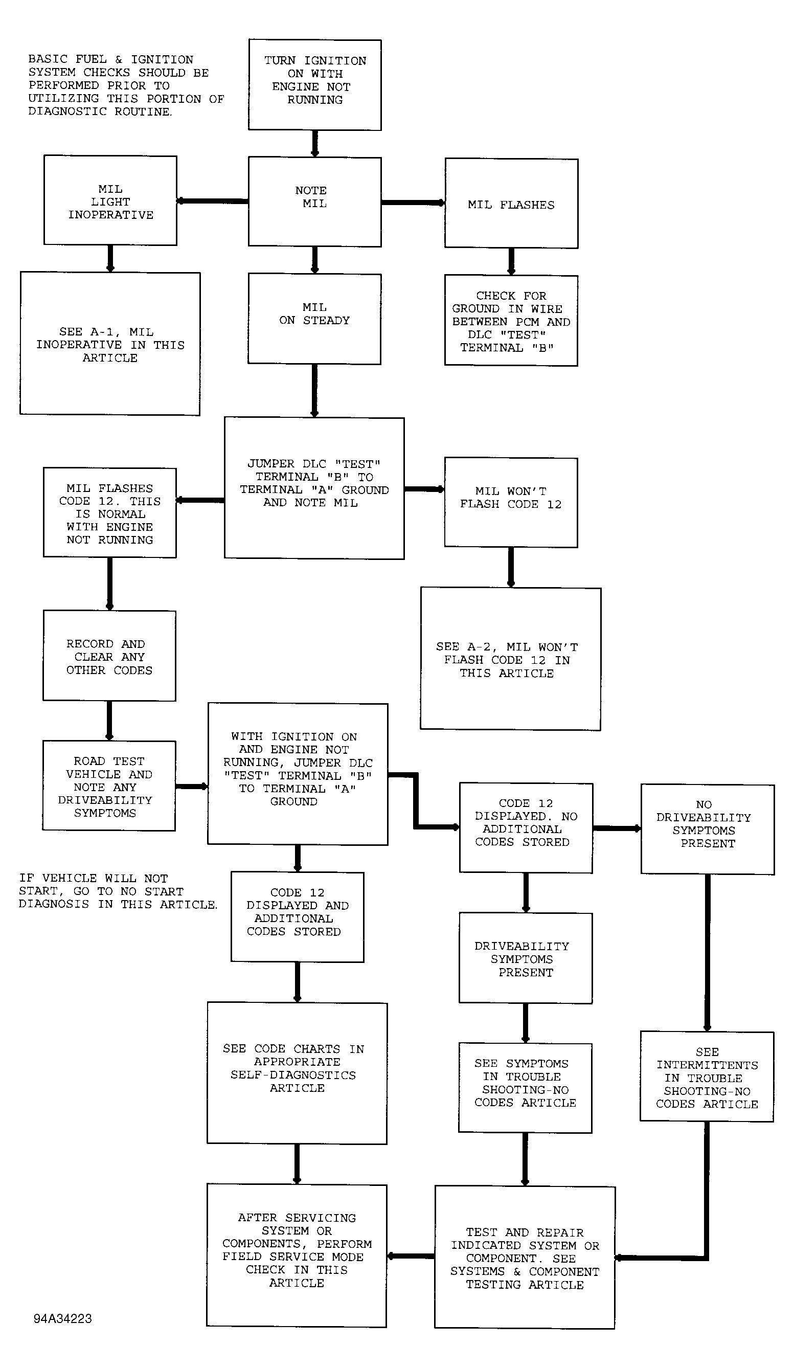 After performing procedures in PRELIMINARY INSPECTION & ADJUSTMENTS, BASIC FUEL SYSTEM CHECKS and BASIC IGNITION SYSTEM CHECKS, this is the starting point for utilizing the self-diagnostic system for determining computer-related problems. See Fig 1 and Fig 2 . After performing necessary tests as described in the diagnostic circuit check, if no codes are indicated and driveability problems still exist, see H - TROUBLE SHOOTING - NO CODES article in this section and SCAN TESTER USAGE in TESTS W/CODES article in this section.