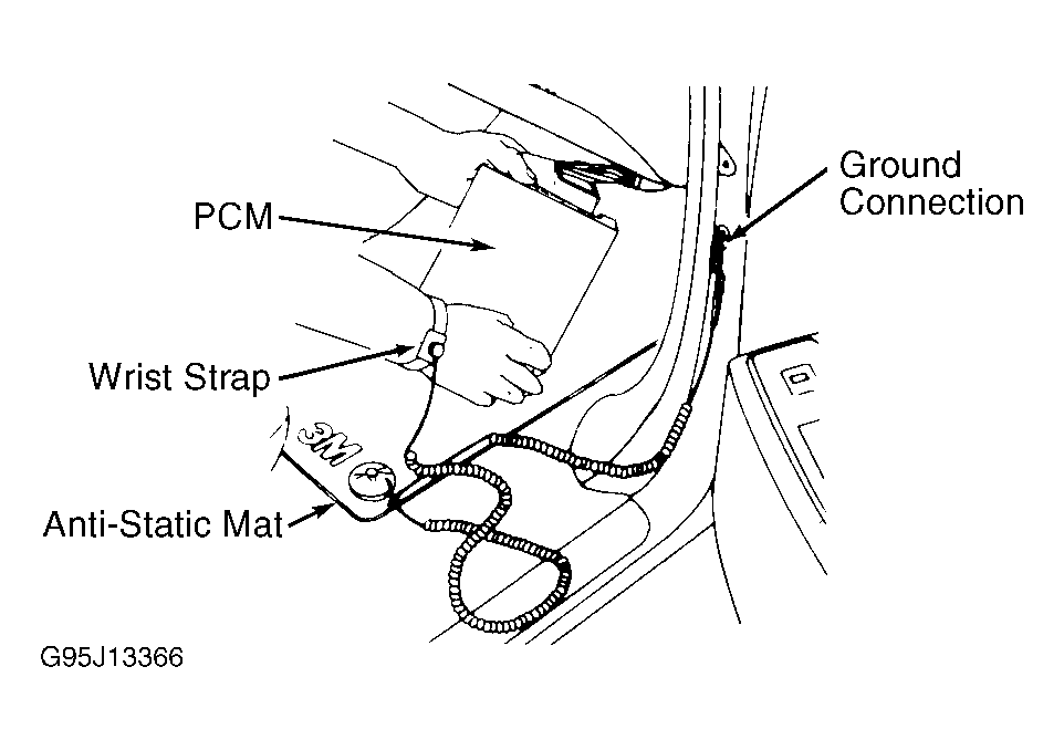 CAUTION: Electronic components used in control systems are designed to carry very low voltages. As little as a 30-volt charge created by static electricity can cause a total or degrading failure in PCM or other electronic components containing integrated circuits. Before servicing PCM, technician must ground himself and the work area to discharge static electricity.