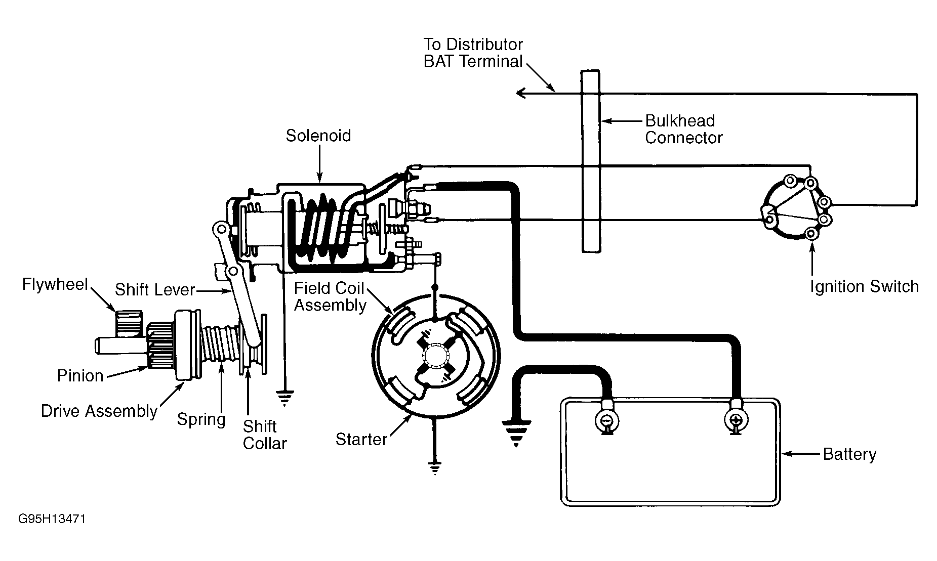 The Delco-Remy starter is part of the cranking circuit, which also consists of the battery, ignition switch and related wiring. See Fig 1. When the ignition switch is turned to the START position, the starter solenoid windings are energized. This causes the solenoid plunger to move the shift lever, which engages the pinion with the engine flywheel ring gear. The movement of the plunger also closes the main solenoid contacts, applying battery voltage to the starter motor.