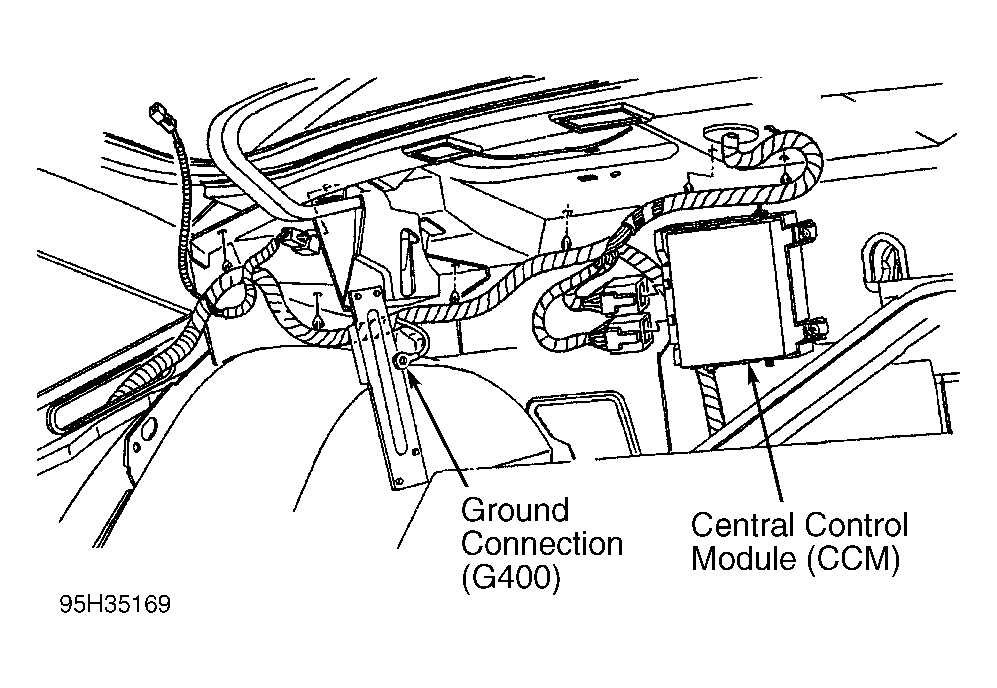 Turn ignition switch to OFF position. Disconnect negative battery cable. Locate CCM in trunk, attached to back of rear seat. See Figure . Remove nuts securing CCM to plastic tray and remove CCM. Disconnect CCM harness connector C1, then harness connector C2. Remove CCM from vehicle. Remove fastener studs from CCM and transfer to new CCM.