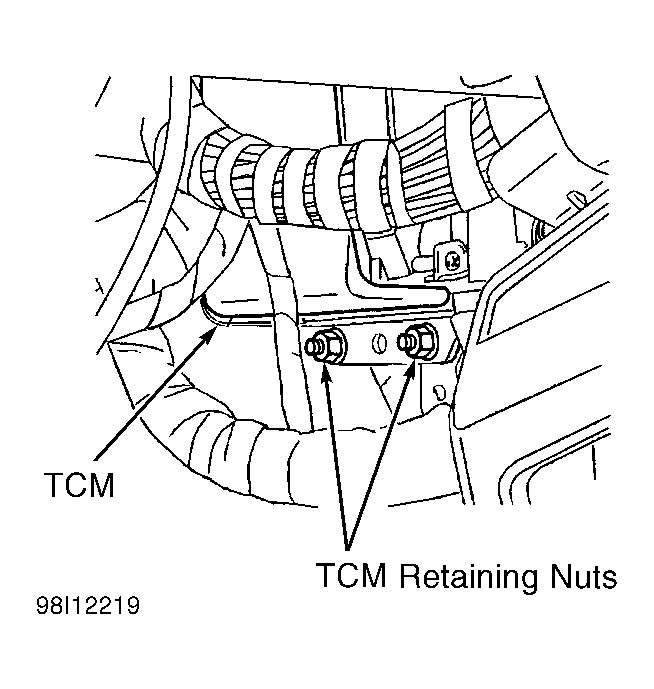 Remove passenger side hush panel and passenger floor outlet retainers. Remove floor outlet and rotate outlet side rearward. Remove TCM retaining nuts. See Figure . Remove TCM. To install, reverse removal procedure.