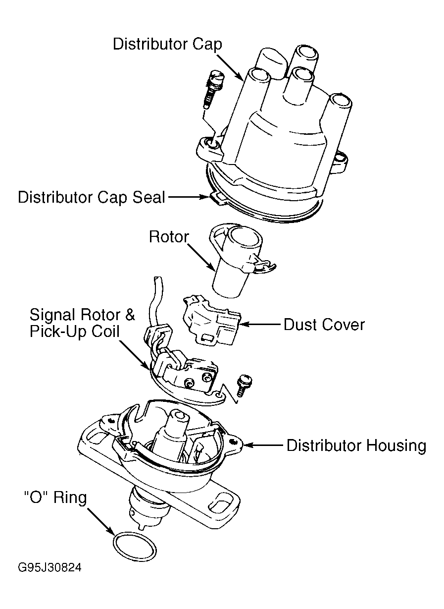 On 1.0L, camshaft position sensor is located in distributor housing and may also be referred to as a pick-up coil. See Figure. Adjust signal rotor air gap to .008-.016" (0.2-0.4 mm) by moving camshaft position sensor in relation to signal rotor.