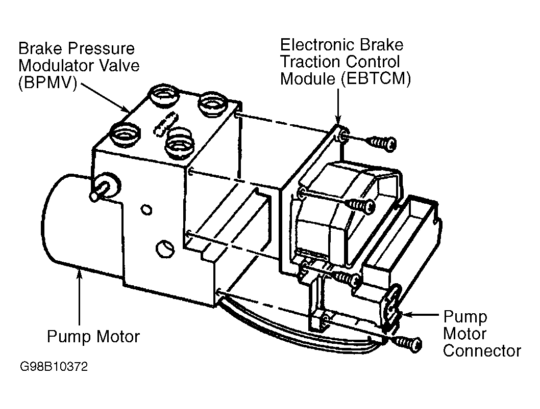 Major system components include the Electronic Brake Traction Control Module (EBTCM), speed sensors mounted at each wheel, 3 instrument cluster warning indicators, brakelight switch mounted at brake pedal, pump motor relay and solenoid valve relay mounted internal of EBTCM, and Brake Pressure Modulator Valve (BPMV). See Fig 1 . BPMV assembly houses electric pump motor and solenoid valves.
