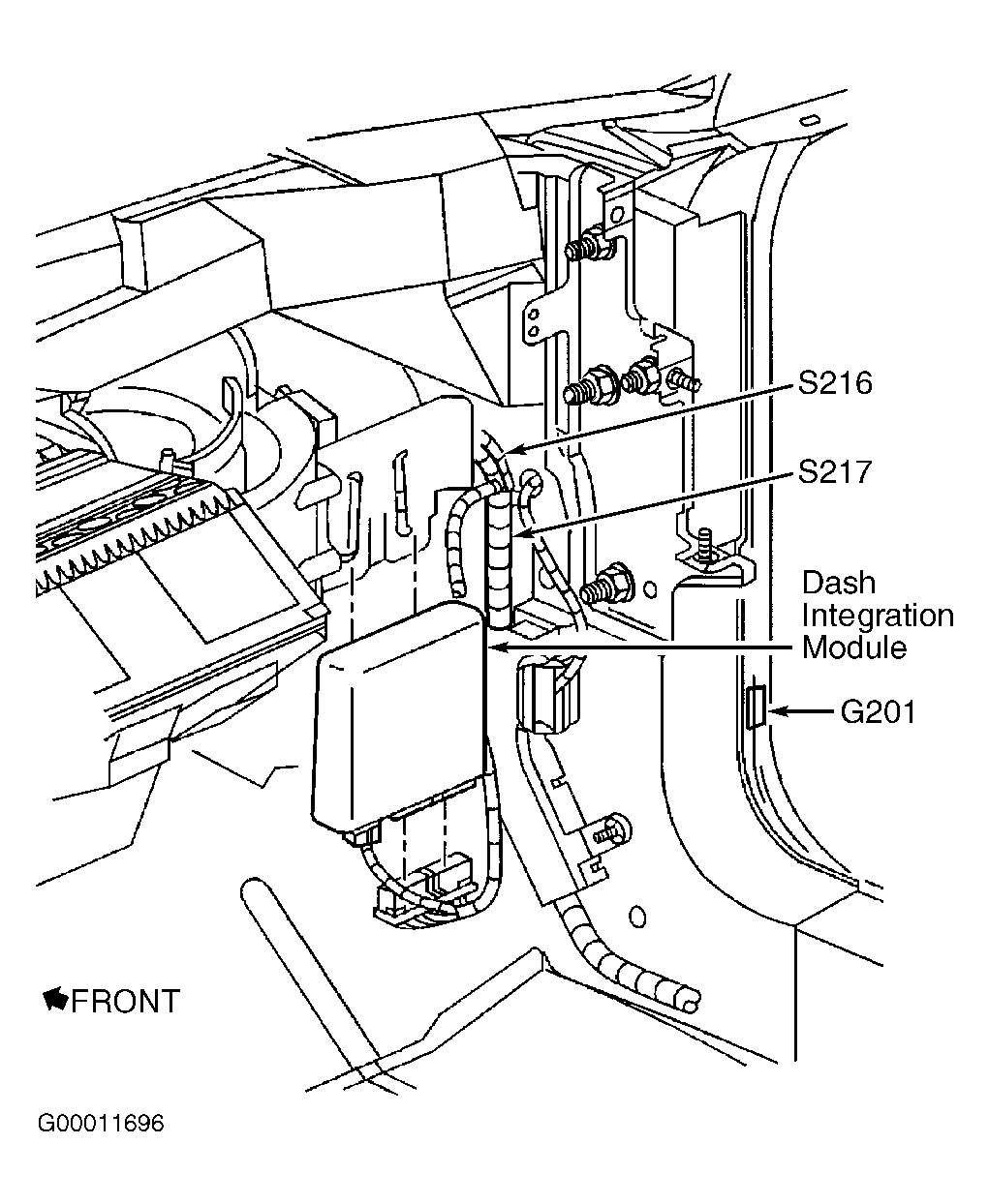 The Dash Integration Module (DIM) is located under right side of instrument panel. See Fig 1 . DIM controlled functions include power moding control (ignition switch states) over Class 2 serial data line, control of headlights, front foglights, exterior lights, interior lights dimming, steering wheel controls, horn relay control for theft activation, Lamps On signal for wiper/washer and low side temperature for HVAC compressor.