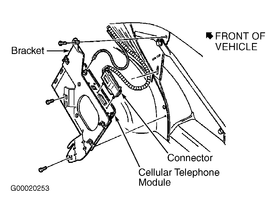 - Disconnect electrical connector and coaxial cable from cellular telephone module. Remove 3 mounting screws attaching module bracket assembly to vehicle. See Fig 1