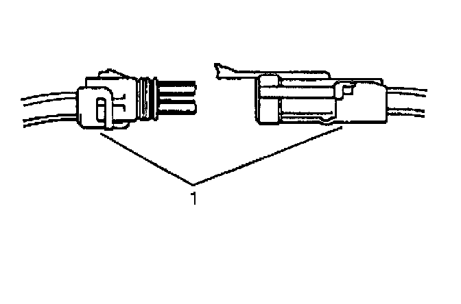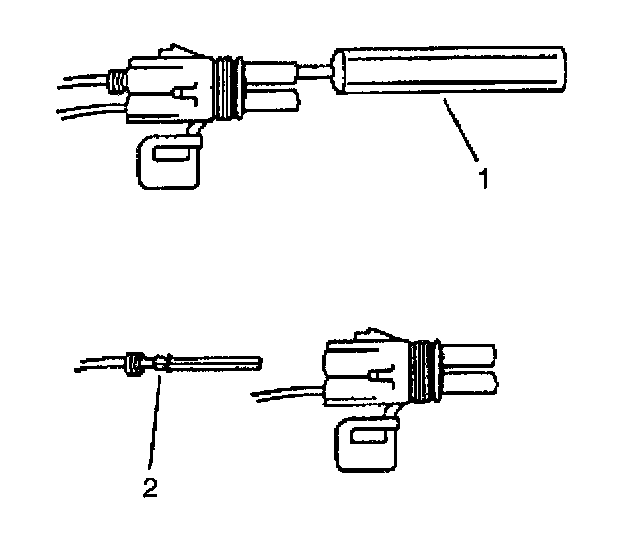 ^ Insert the Weather Pack(R) terminal removal tool into the front (mating end) of the connector cavity until it rests on the cavity shoulder (1).